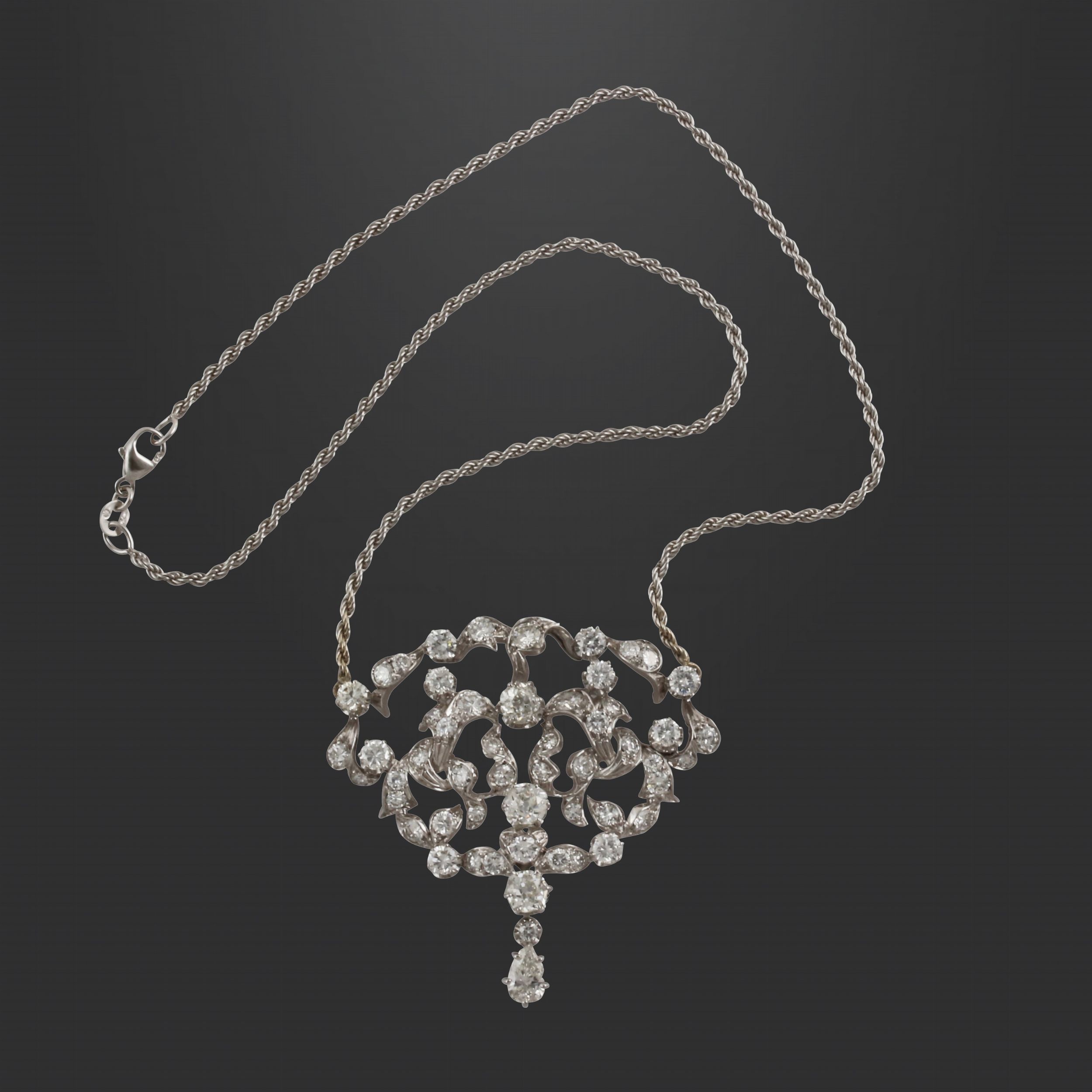 in oro bianco con catenina a cordoncino evidenziata al centro da un motivo traforato ornato da brillanti e diamante a goccia sospeso, gr. 15,2. Diamanti del peso complessivo di 4 ct ca.Lunghezza 41 cm