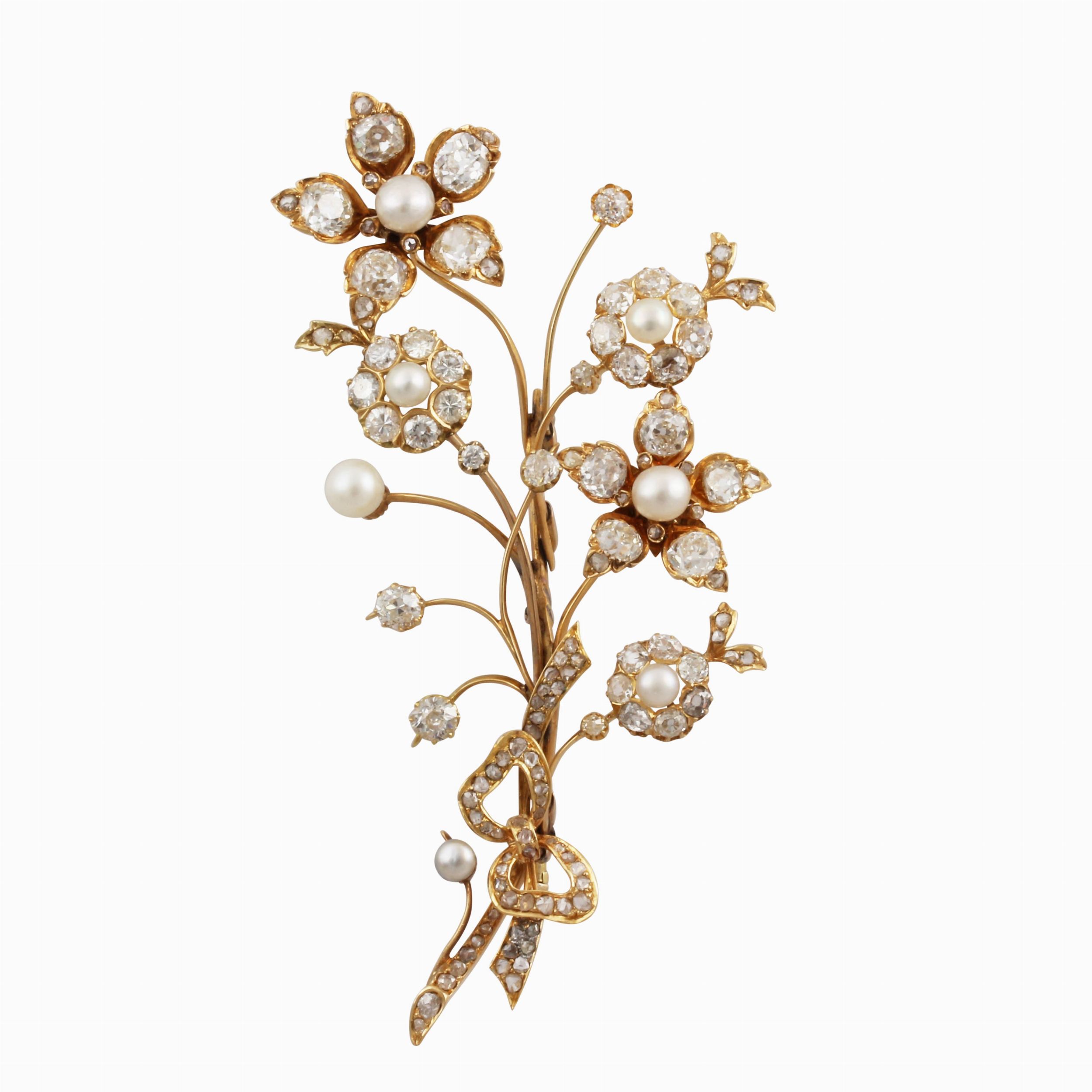 in oro giallo raffigurante un tralcio fiorito e fogliato ornato da diamanti e perle, trattenuto da un fiocco in diamanti taglio a rosa, gr. 28,8. Diamanti del peso complessivo di 7 ct ca.Dimensioni 10,5 x 5,3 cm ca.