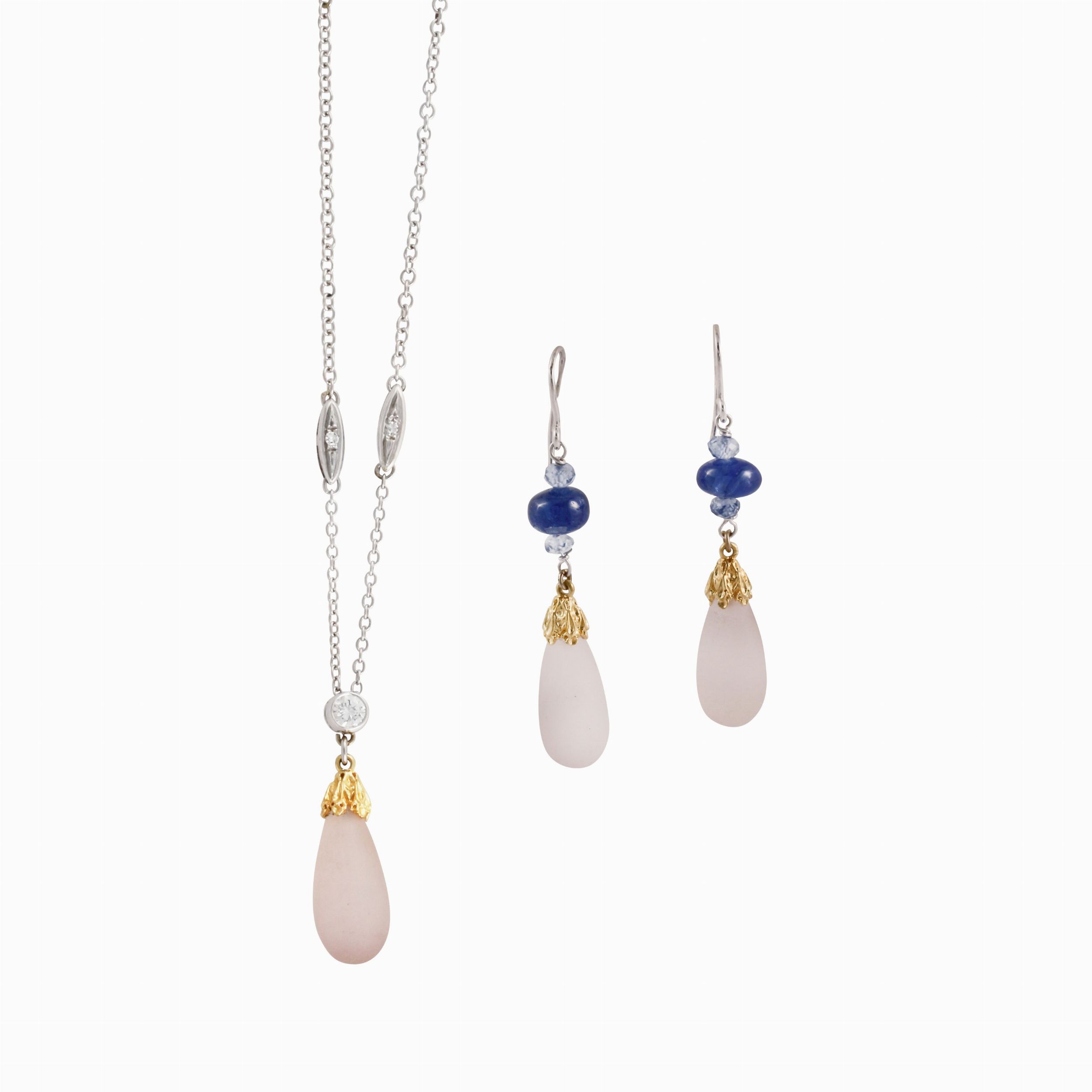 composto da collana e orecchini pendenti in oro bianco e giallo con zaffiri, diamanti e gocce in cristallo di rocca sospese, gr. complessivi 13,6.Collana lunghezza 41,5 cm