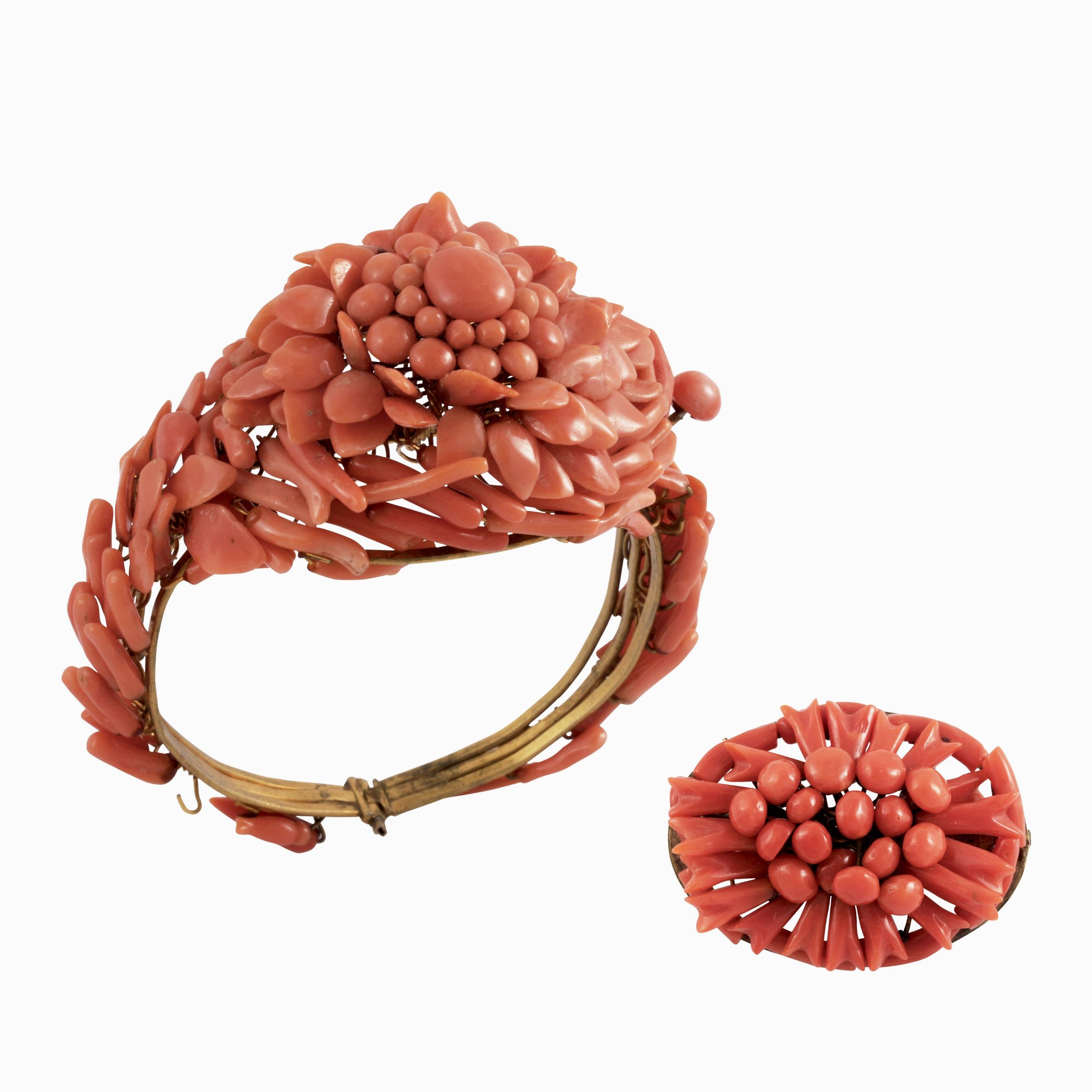 composto da bracciale rigido a fascia e spilla ovale con coralli, montati in metallo dorato (mancanze). Misura bracciale 16 cm ca., spilla 4,2 x 3,2 cm ca.