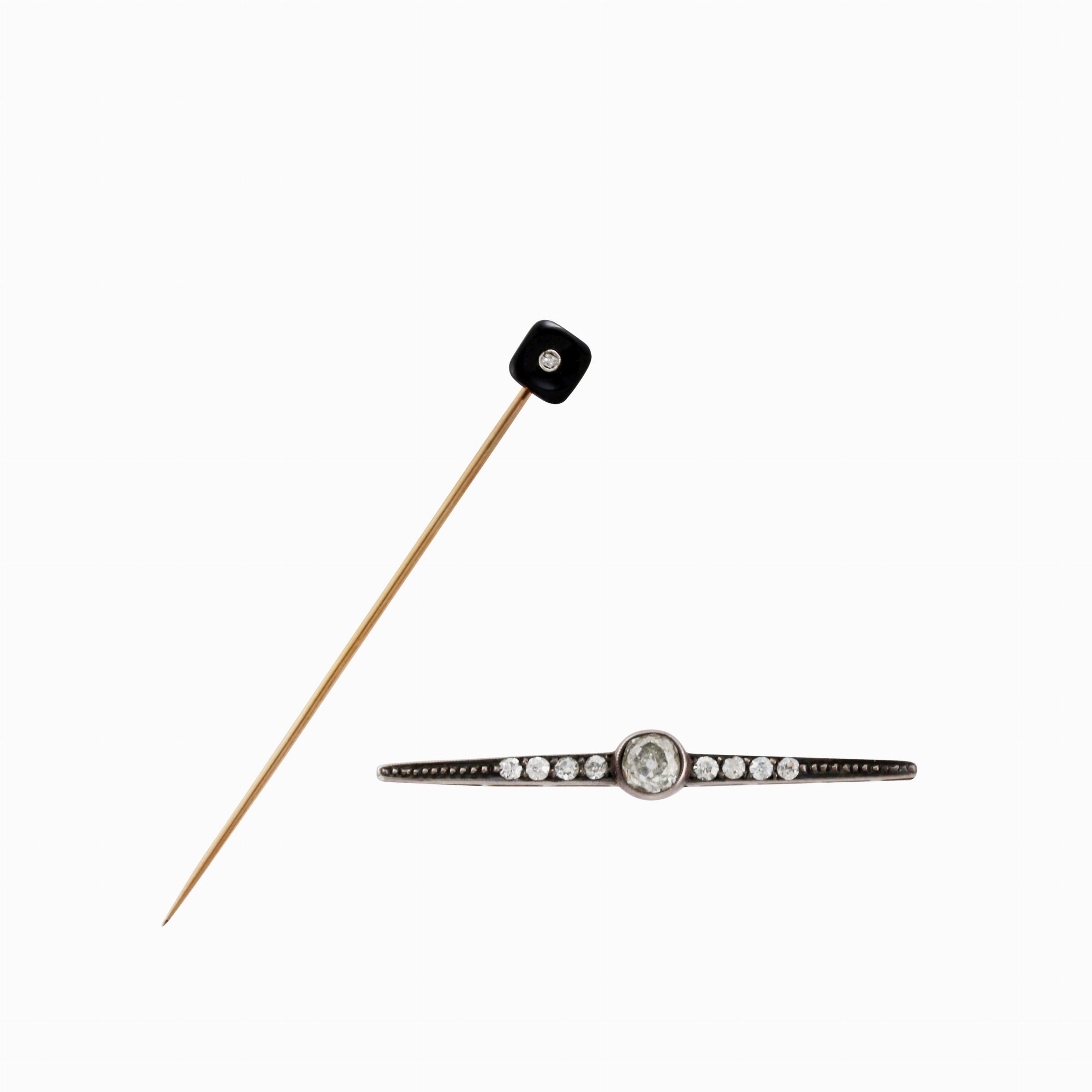 composto da spilla a barretta in argento e diamanti e spilla da cravatta in oro giallo sormontata da un'onice con piccolo diamante, gr. complessivi 4.