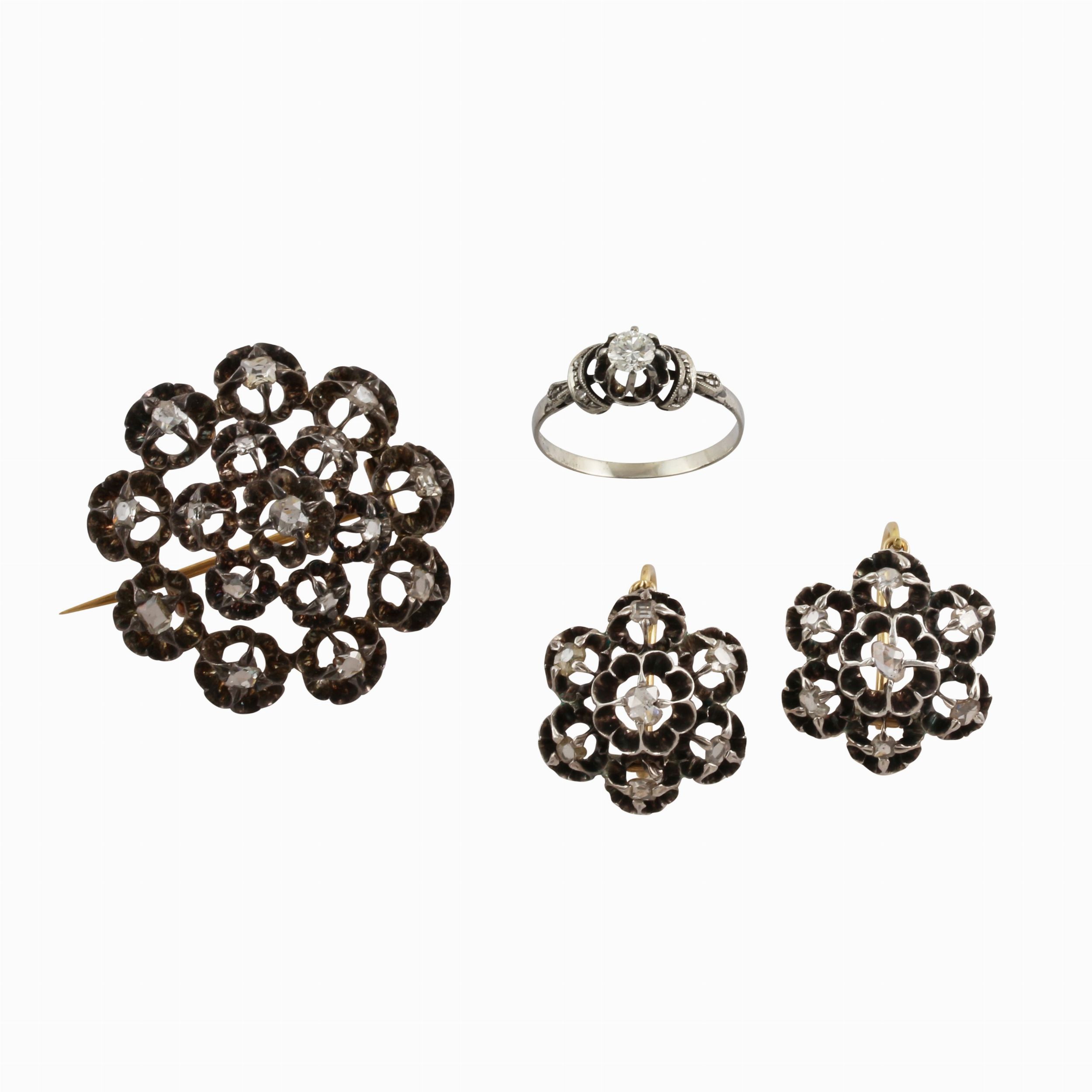 composto da parure di orecchini e spilla in oro e argento a rosone traforati con diamanti taglio a rosa e anello in oro bianco con brillante centrale e piccoli diamanti, gr. complessivi 21.Misura anello 18