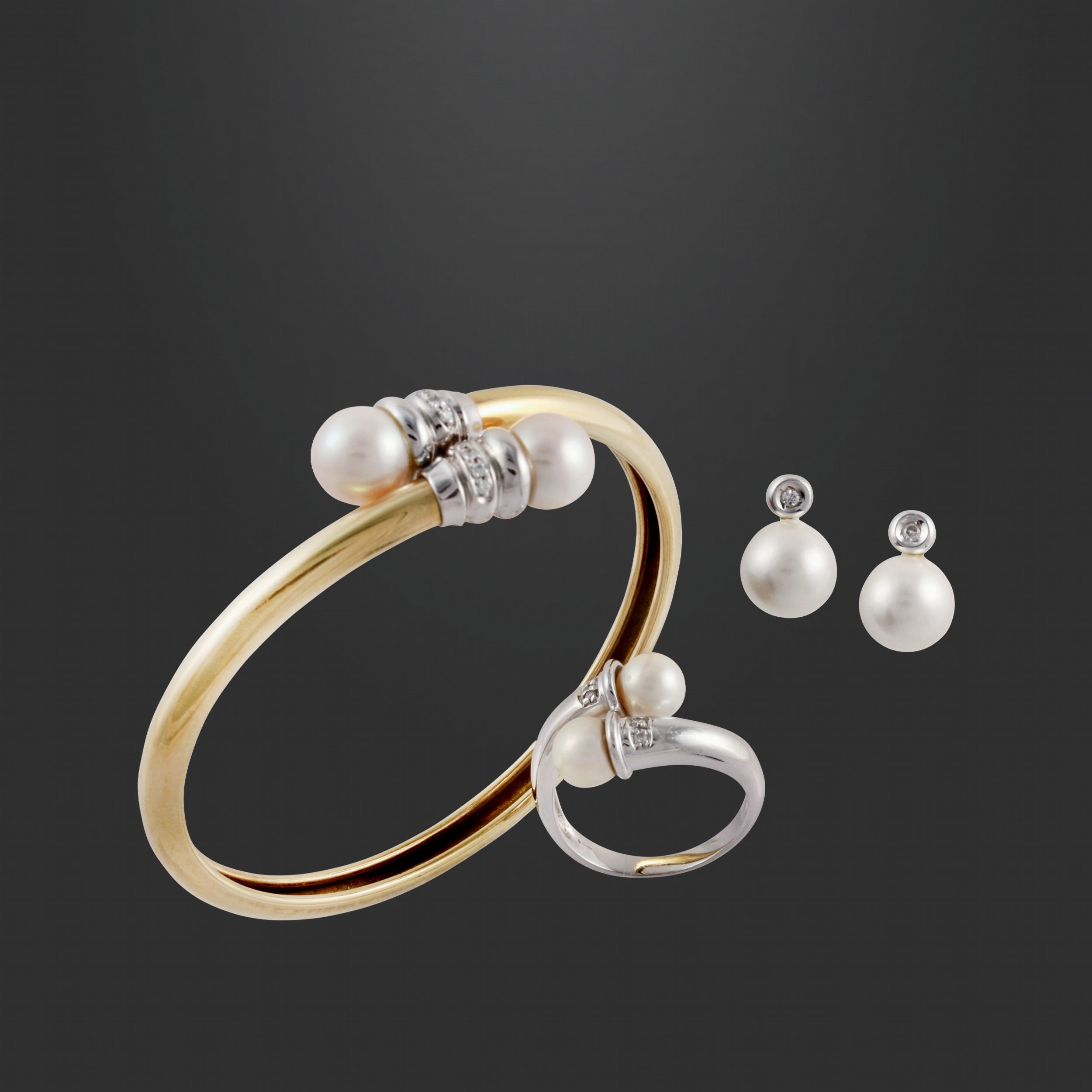 composto da bracciale rigido contrarié, anello e orecchini in oro con perle e brillanti, gr. complessivi 27,9.Bracciale misura 16 cm ca., anello misura 16,5Numerario: 1481 AL (Damiani-Salvini - Valenza)Bracciale e orecchini firmati: Mikawa