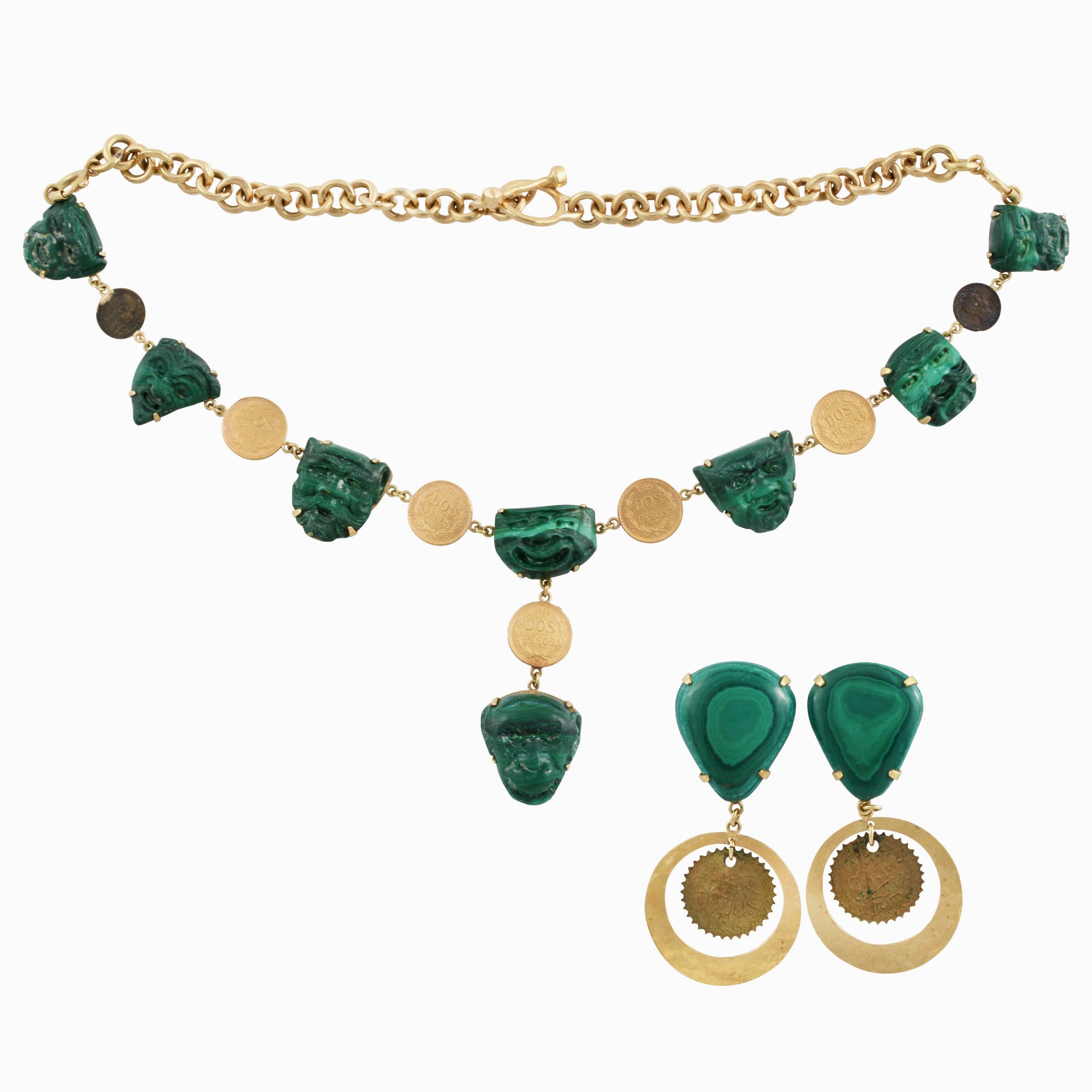 di collana in oro giallo a maglie tonde ornata anteriormente da un motivo staccabile con otto mascheroni in malachite alternati a cinque pesos in oro e due in argento e orecchini pendenti in oro ciascuno con malachite a goccia e cerchio con al centro un disco dai margini dentellati in metallo, gr. complessivi 89.