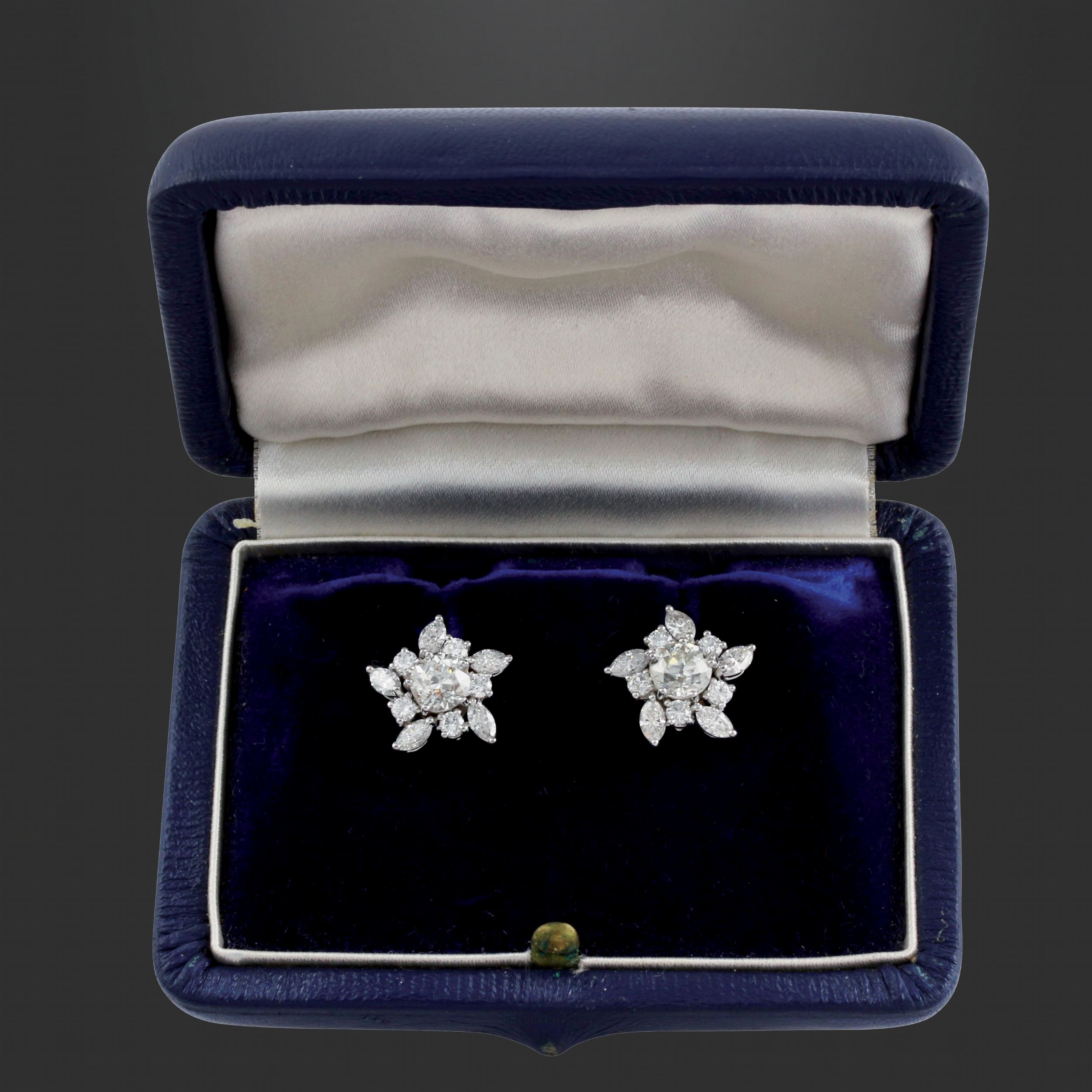 in platino a guisa di fiore con diamanti centrali del peso complessivo di 1,40 ct ca., contornati da brillanti e diamanti navettes, gr. 8,1. Corredati da custodia.Numerario: 26 AL (Illario Carlo & F.lli S.p.A. - Valenza)