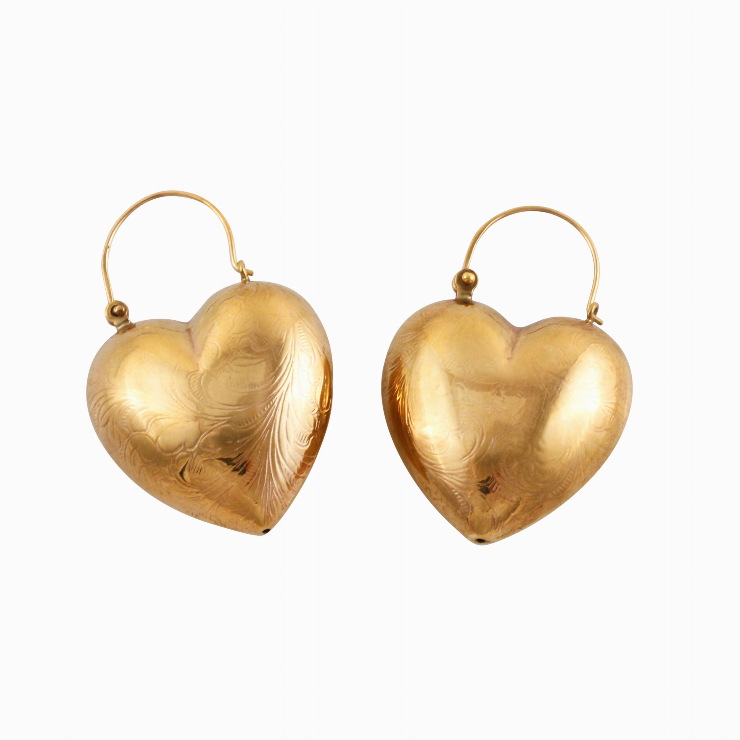 a cuore bombati e incisi, realizzati in oro a titolo basso (piccole ammaccature) gr. 12,6.Dimensioni 4,8 x 3,2 cm ca.