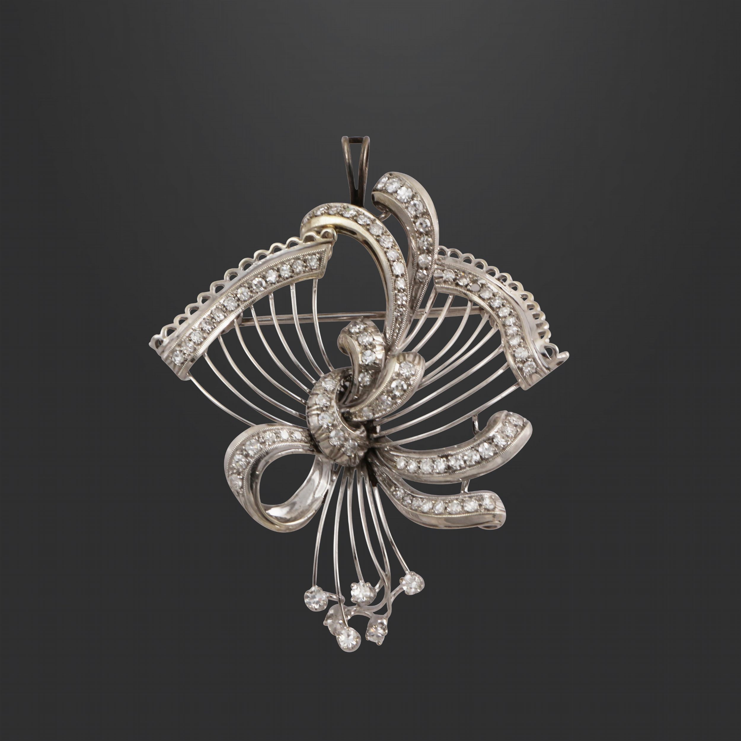 in oro bianco a fiocco stilizzato ornata da diamanti (uno mancante), gr. 17,1.Dimensioni 5,8 x 5 cm ca.