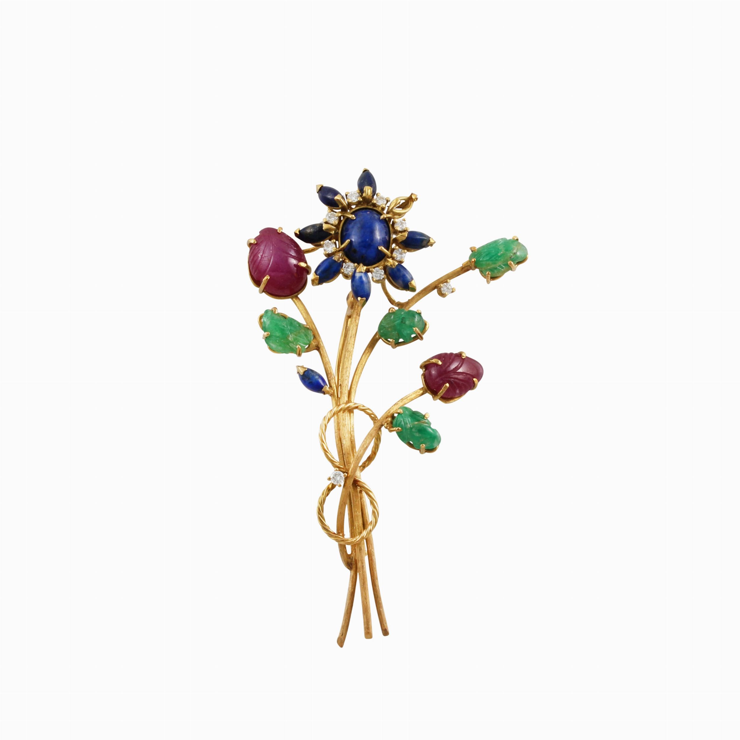 in oro giallo a tralcio fiorito con lapislazzuli (uno mancante), brillanti, rubini e smeraldi incisi, gr. 16.Dimensioni 7,7 x 4,5 cm ca.