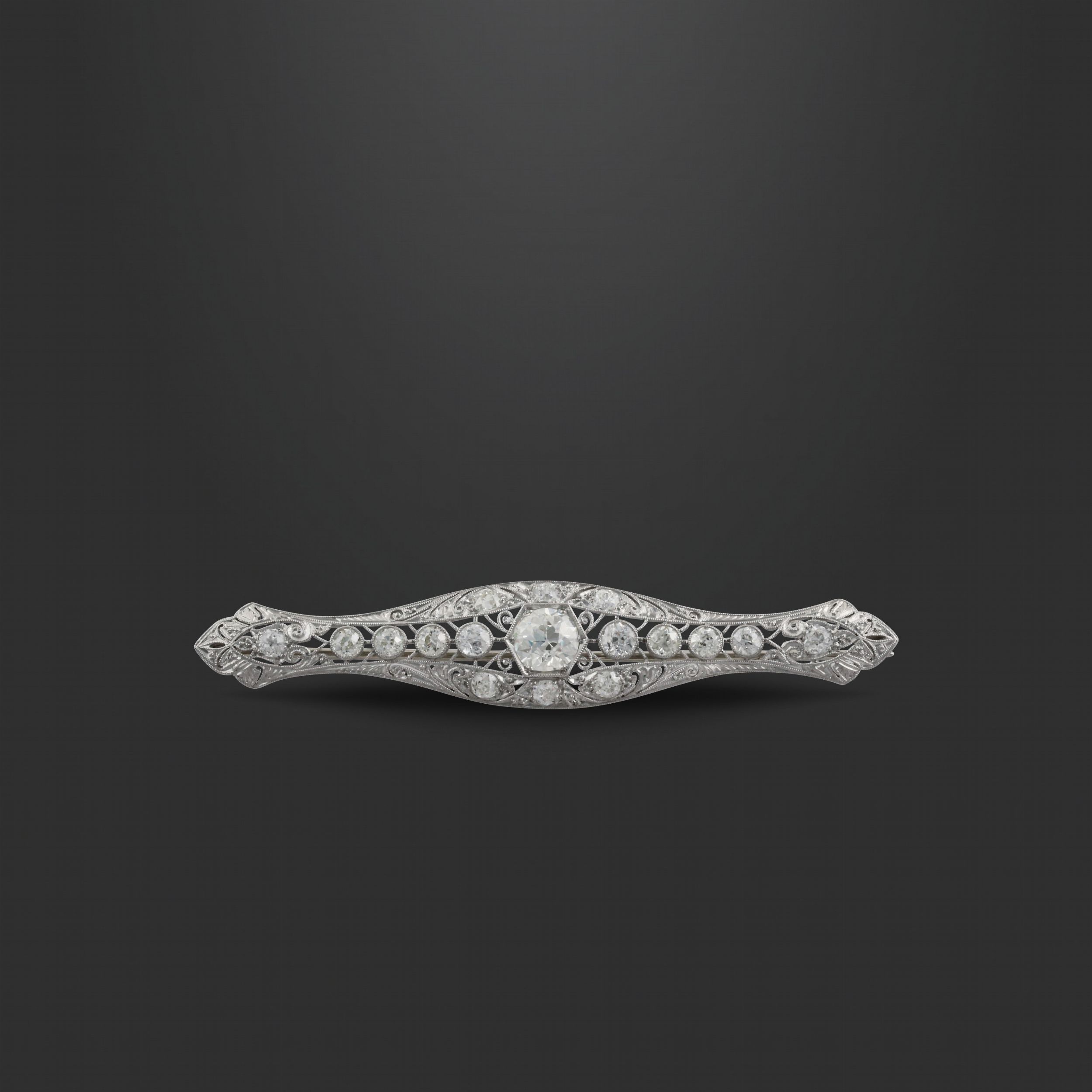 barretta realizzata in iridio e platino finemente cesellata e traforata, ornata da diamanti di cui uno di dimensioni maggiori disposto al centro del peso di 1,50 ct ca., restanti diamanti del peso complessivo di 1,30 ct ca., gr. 10,7.