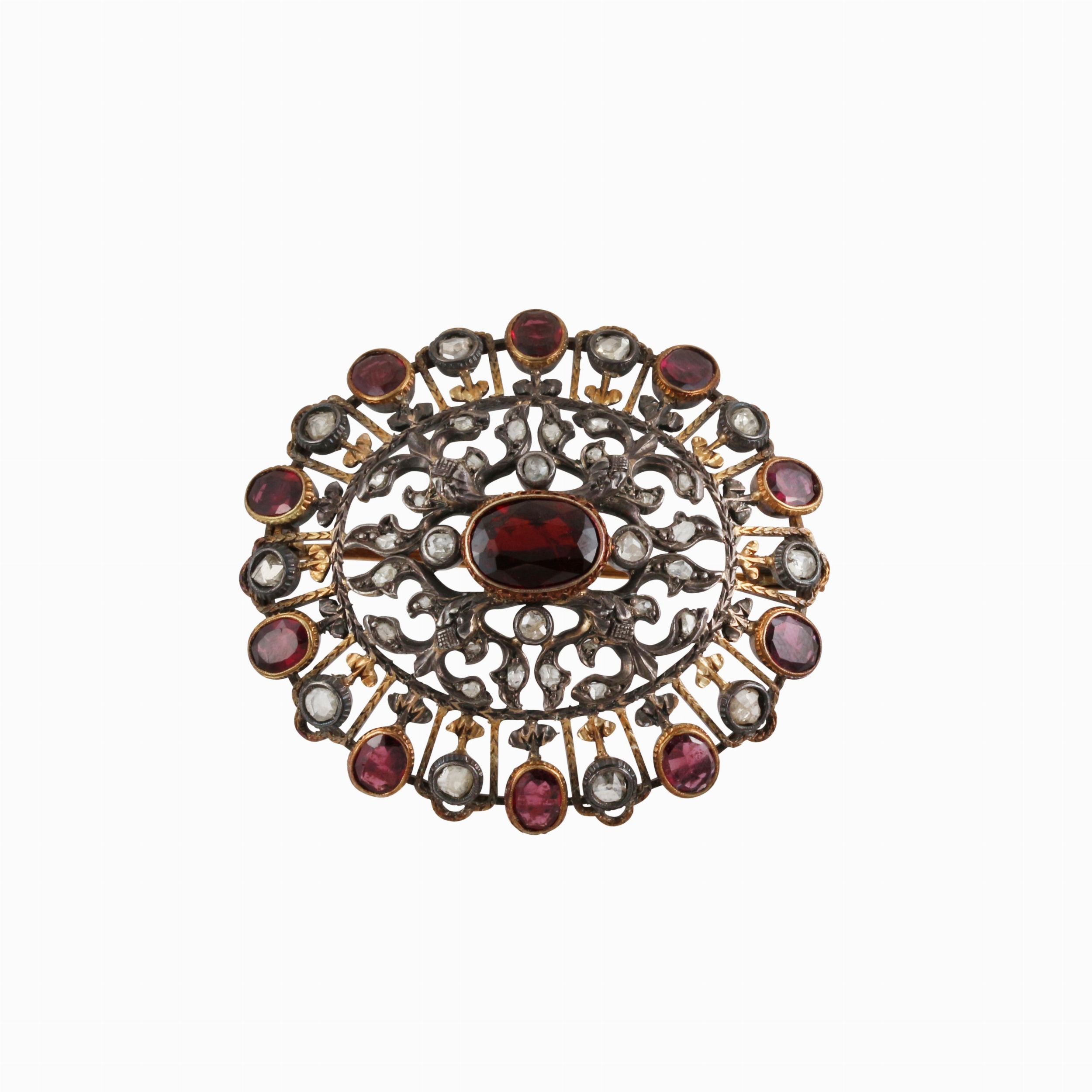 in oro e argento a forma ovale finemente traforata ornata da diamanti taglio a rosa e granati, gr. 17,9.Dimensioni 4,5 x 4,2 cm ca.Inizi XX secolo