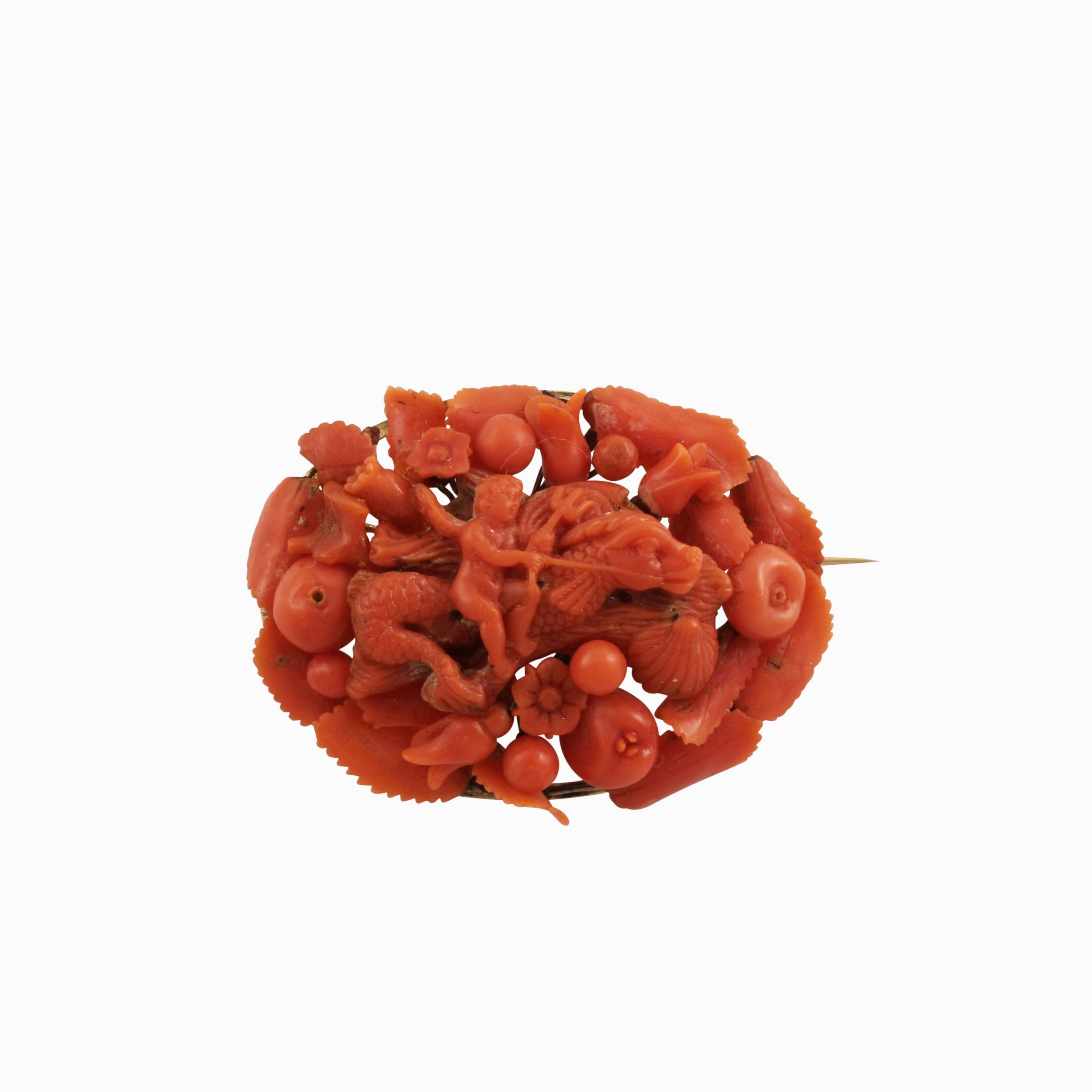 a forma ovale con corallo inciso raffigurante Nettuno con mostro marino, fiori e frutti, montatura in oro giallo, gr. 15,6.