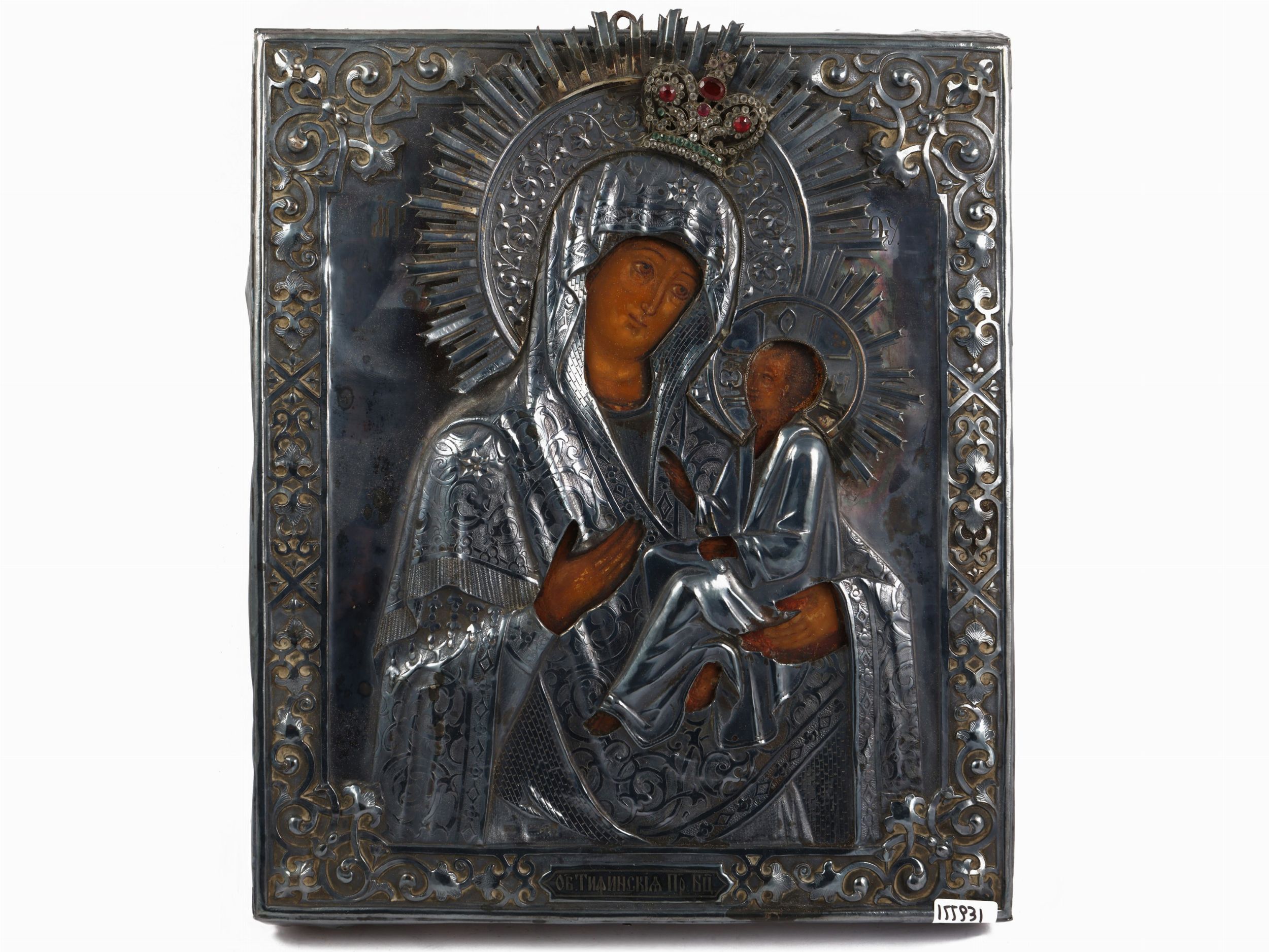 Mosca, 1859 Madonna con Bambino, ritza in argento e vetri, tempera su tavola, difetti alla parte pittorica
