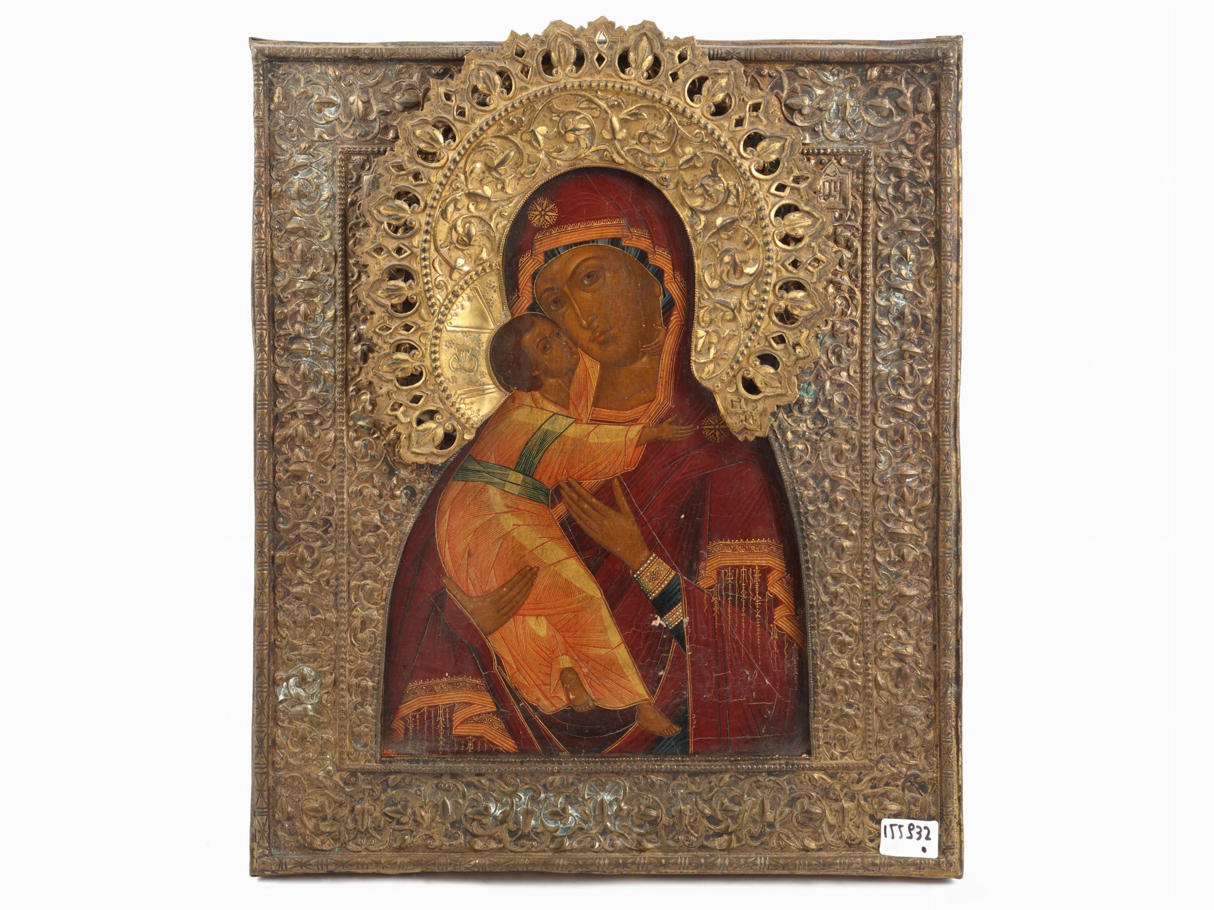 Russia, XIX/XX secolo Madonna con Bambino, ritza in metallo dorato, tempera su tavola