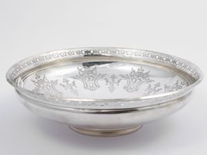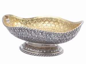 gr 670, h cm 11,5x27x20 di forma ovale, cesellata con motivo di penne di pavone, bordo a cordonetto, interno v [..]