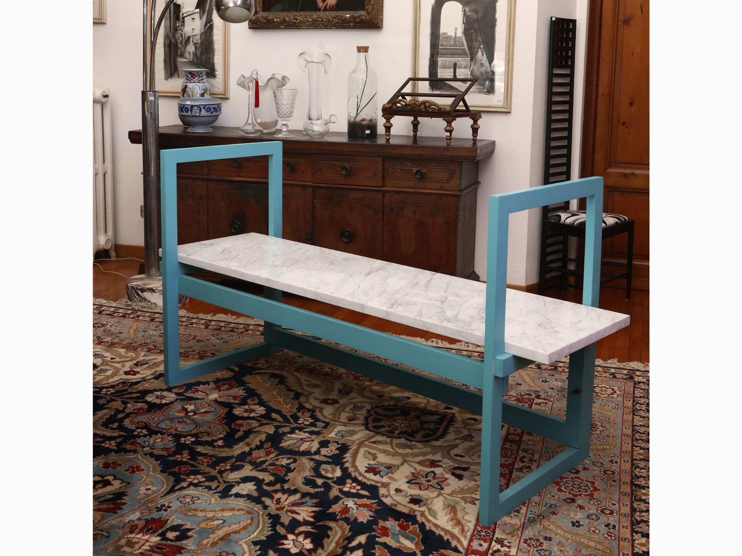 panca in legno laccato con piano in marmo, multiplo, reca firma dell’artista con timbrata a fuoco e con il marchio di Megalopoli, alcune cadute di colore