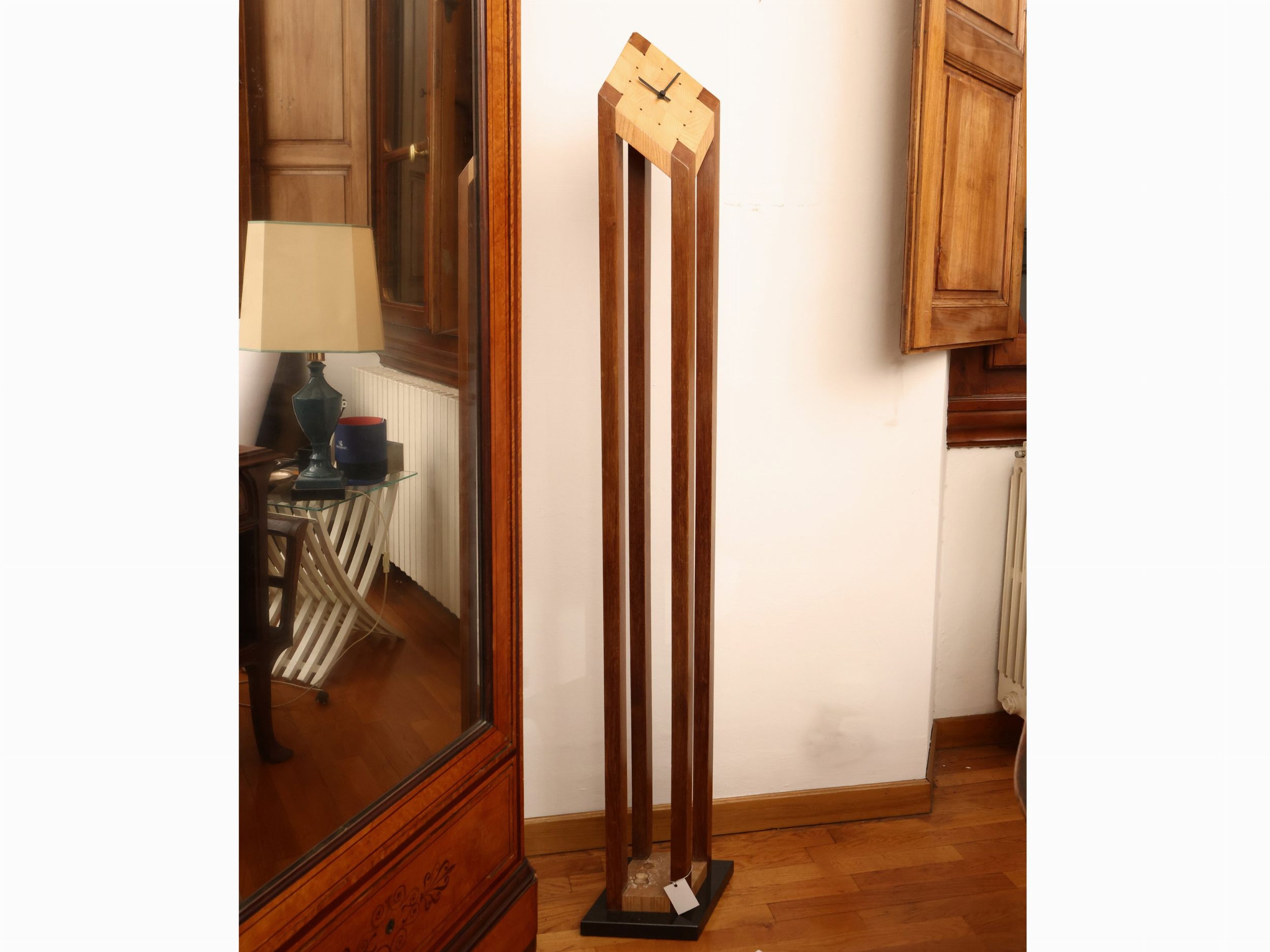 (XX-XXI secolo) orologio da terra in mogano, frassino, ebano, su base in marmo nero, multiplo