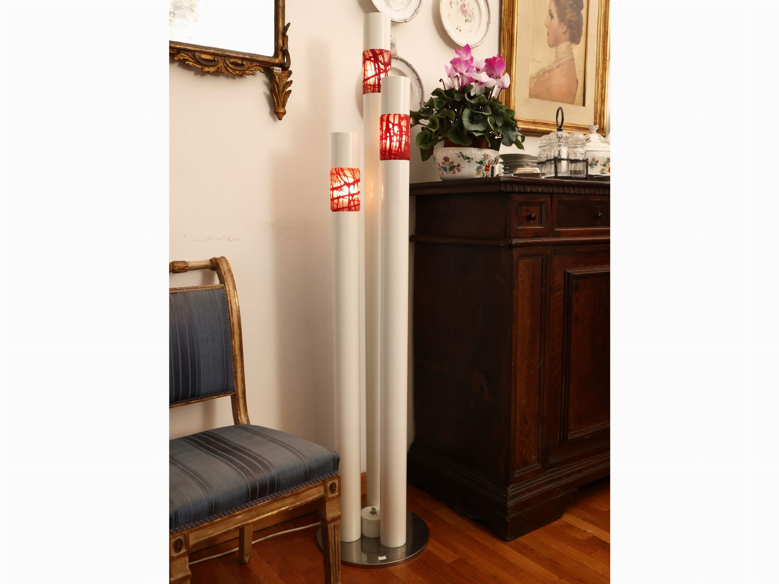 Italia, Anni Settanta realizzata come tre colonne cilindriche con finali in vetro ghiacciato con filamenti rossi, piede circolare cromato
