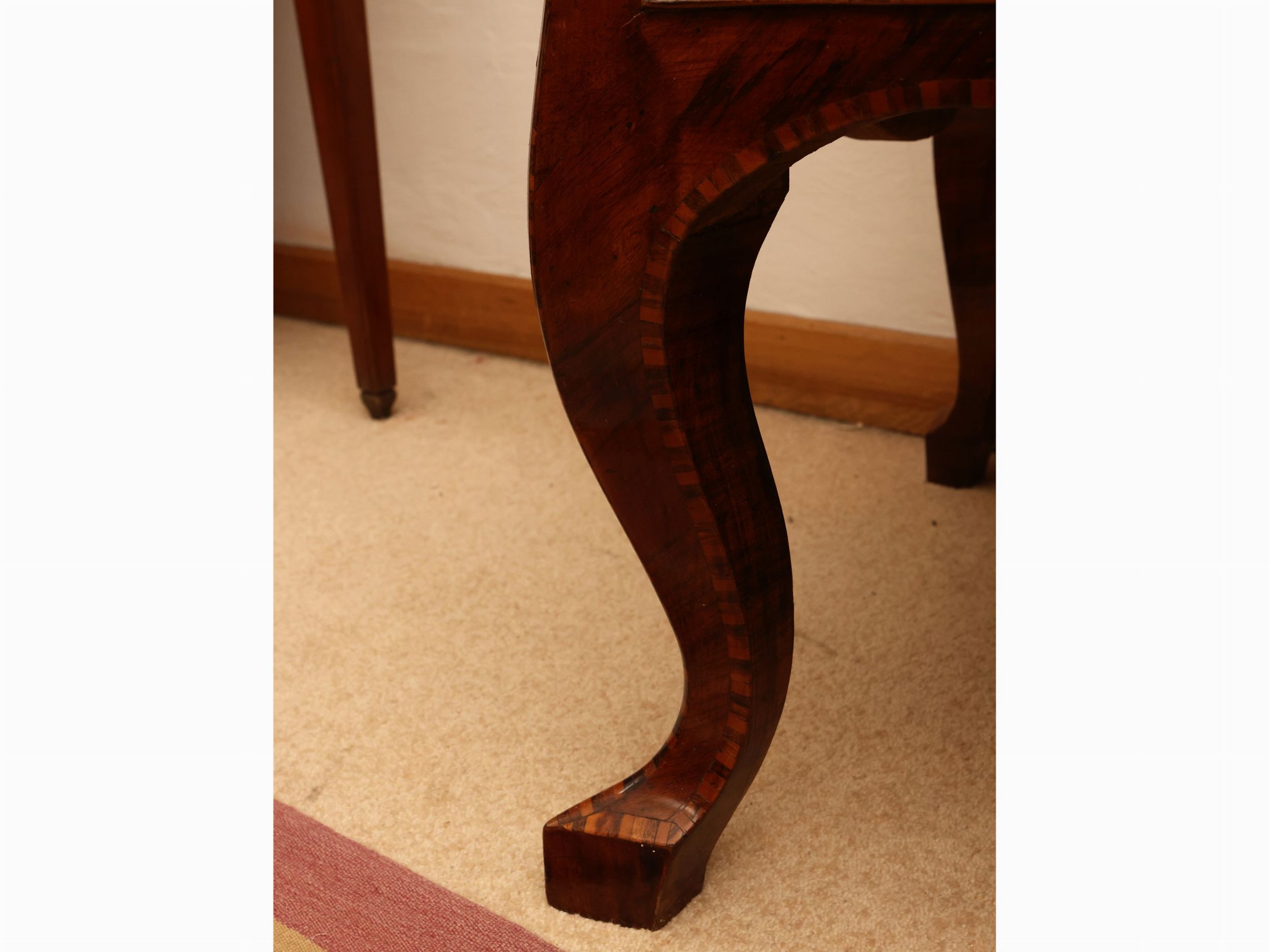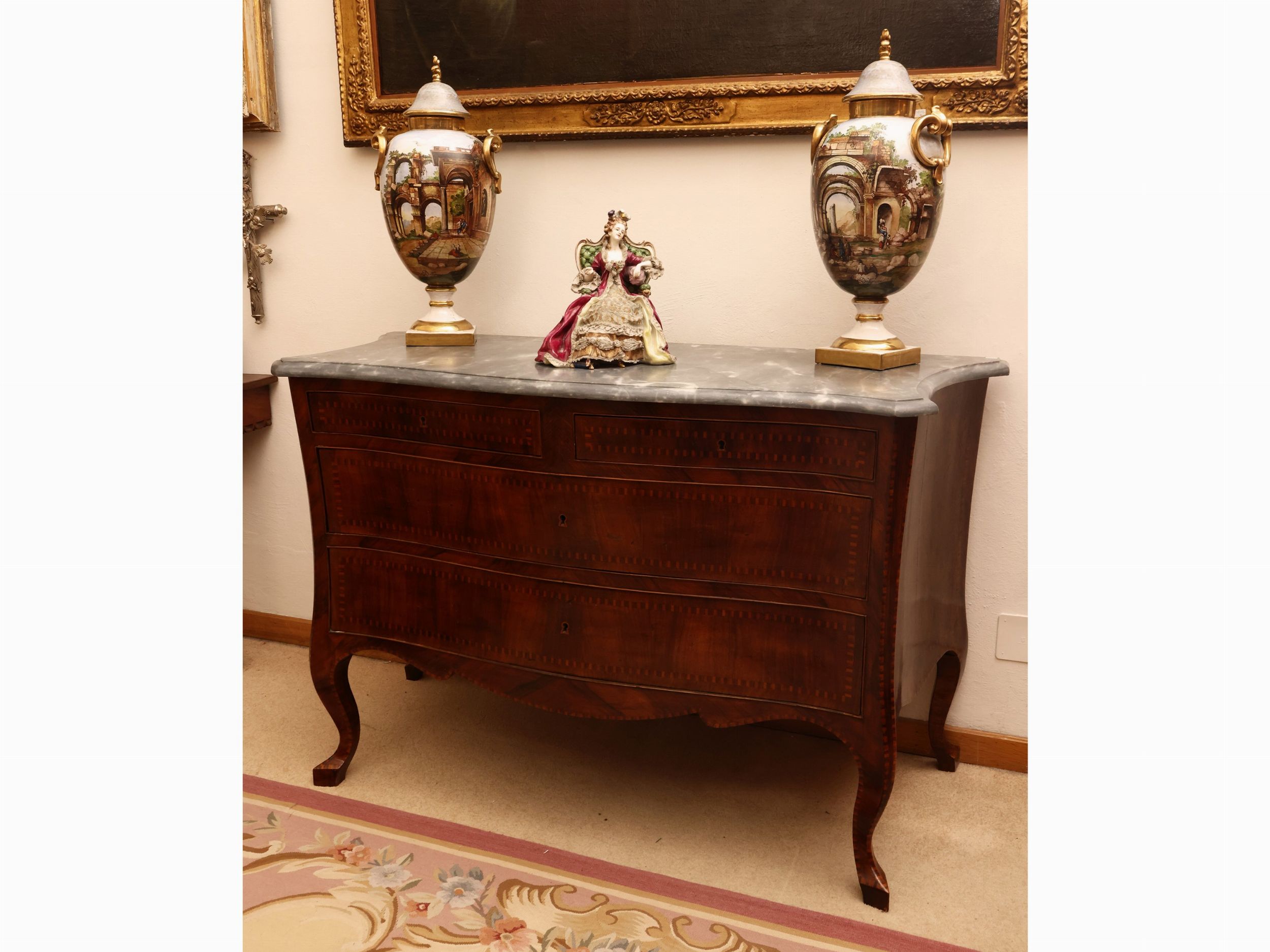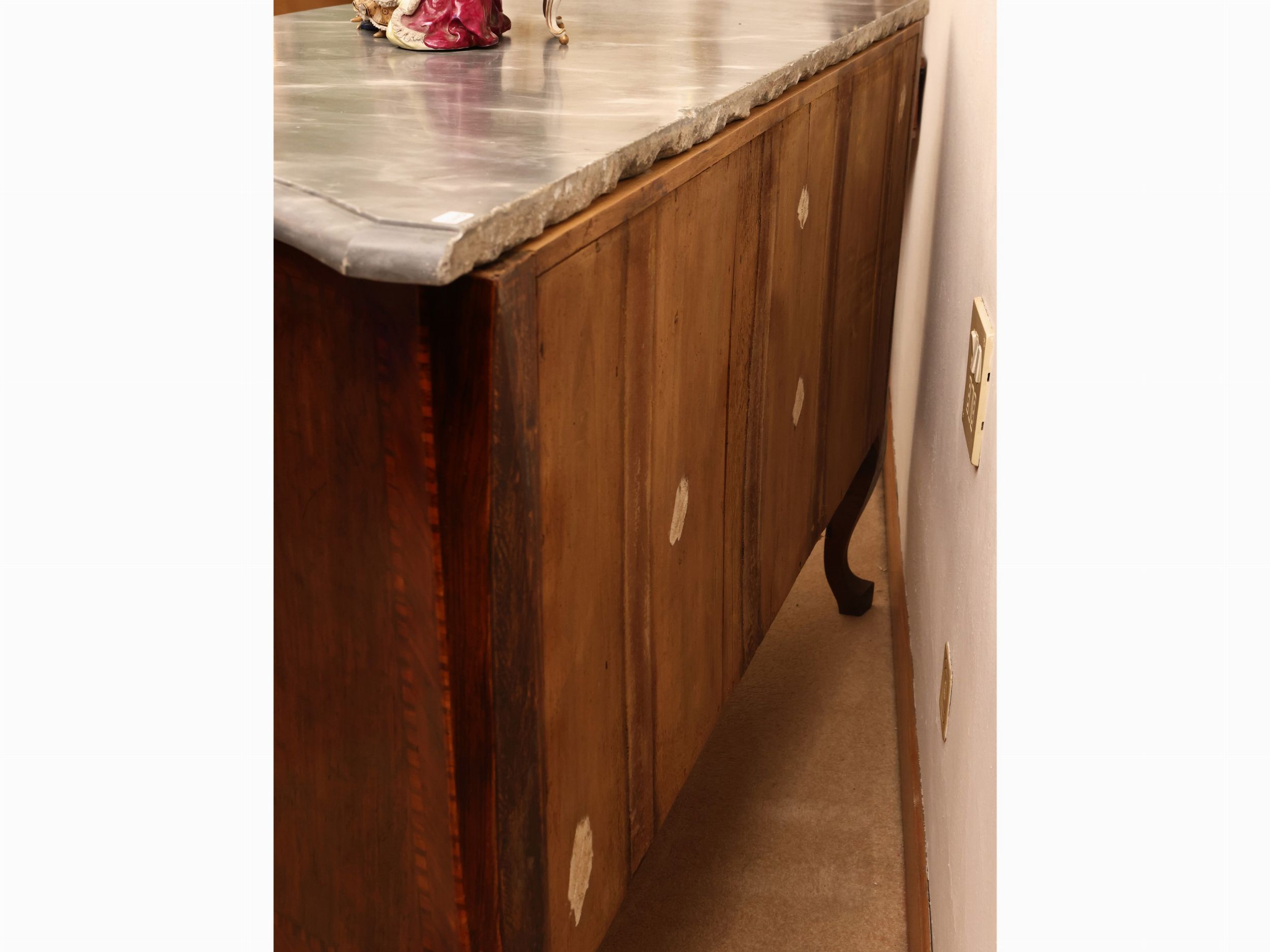 h cm 92x59x144 Toscana, metà del XVIII secolo intarsiato con filettature a nastro, piano sagomato in marmo bardiglio (lievi difetti) con due mezzi cassetti sottostanti e due cassetti sul fronte mosso, piedi a voluta con finale a zoccolo stilizzato