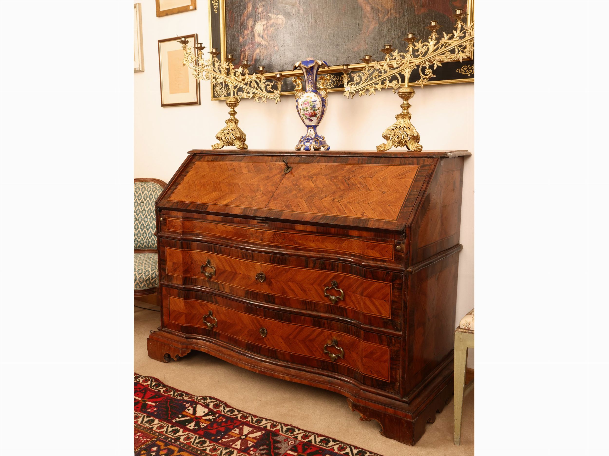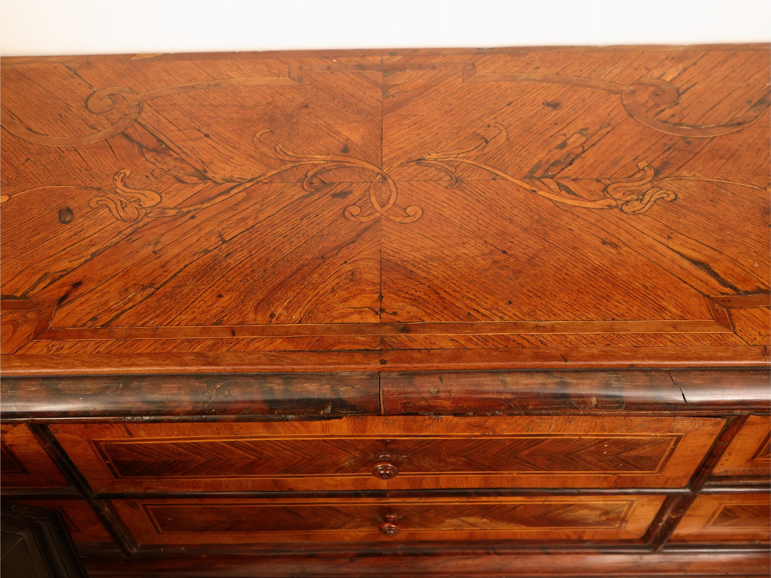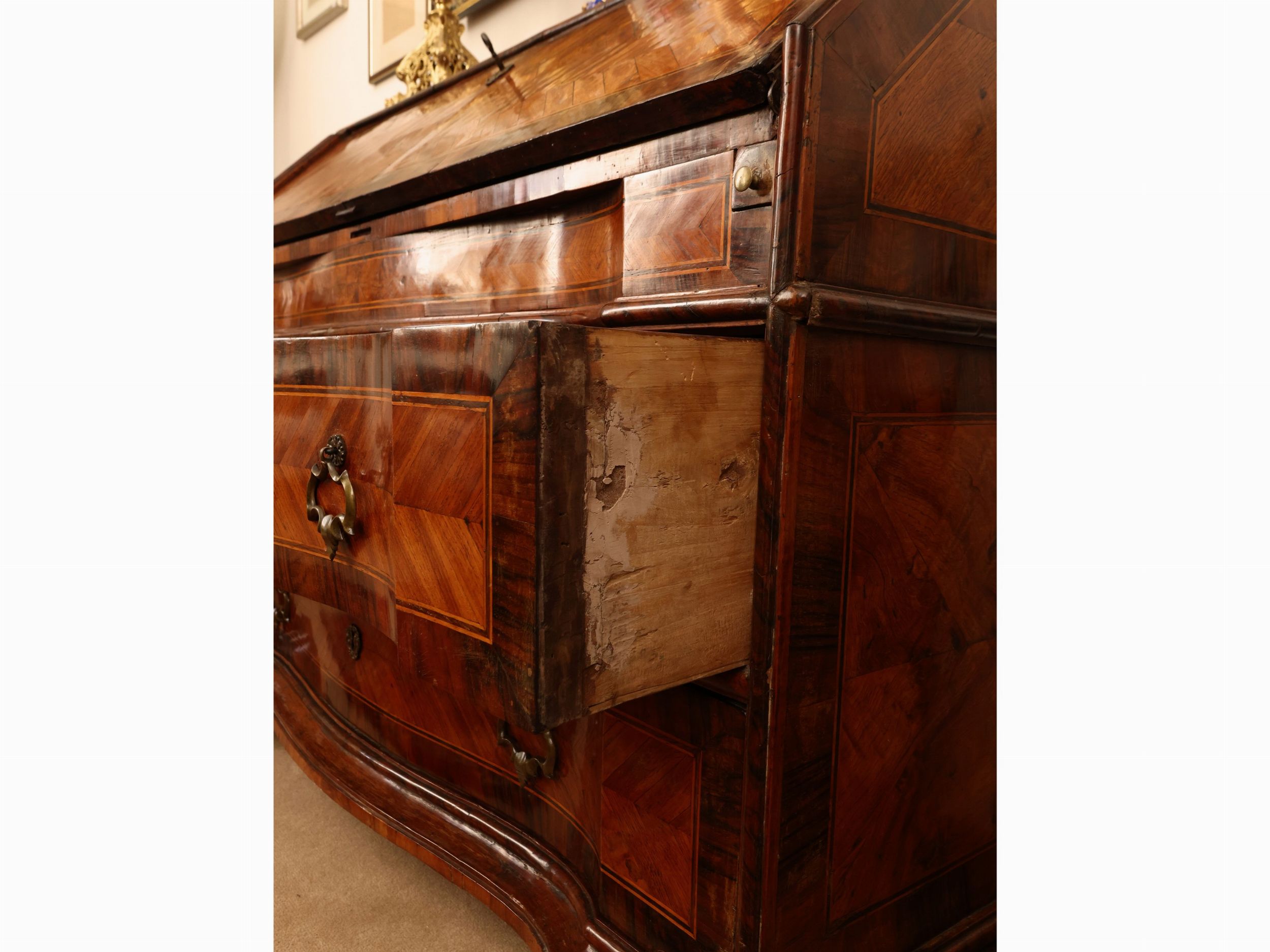 h cm 106x145x60,5 seconda metà del XVIII secolo sportello a calatoio, all'interno intarsiato con filettature disposte a formare motivi geometrici, due cassetti sul fronte a doppia mossa, piedi a mensola, difetti
