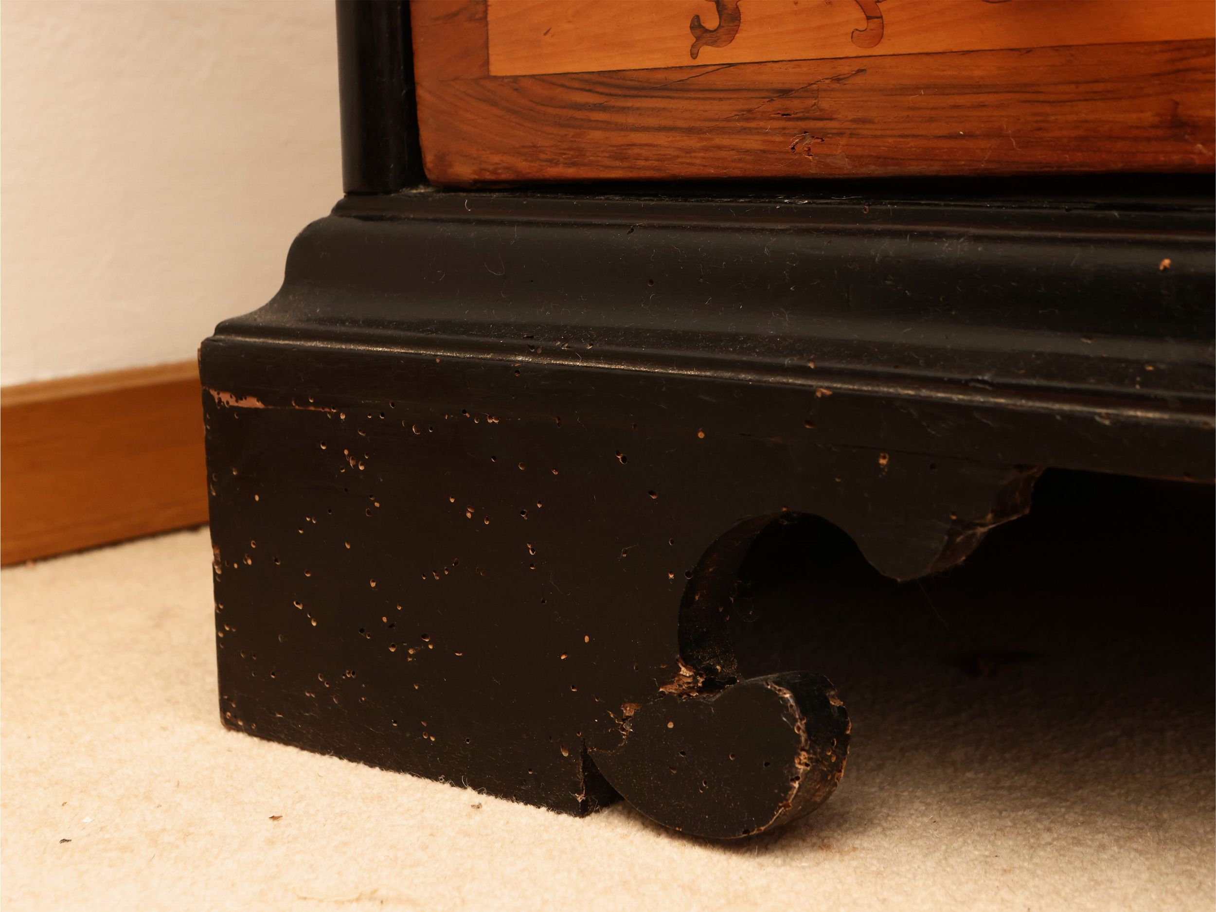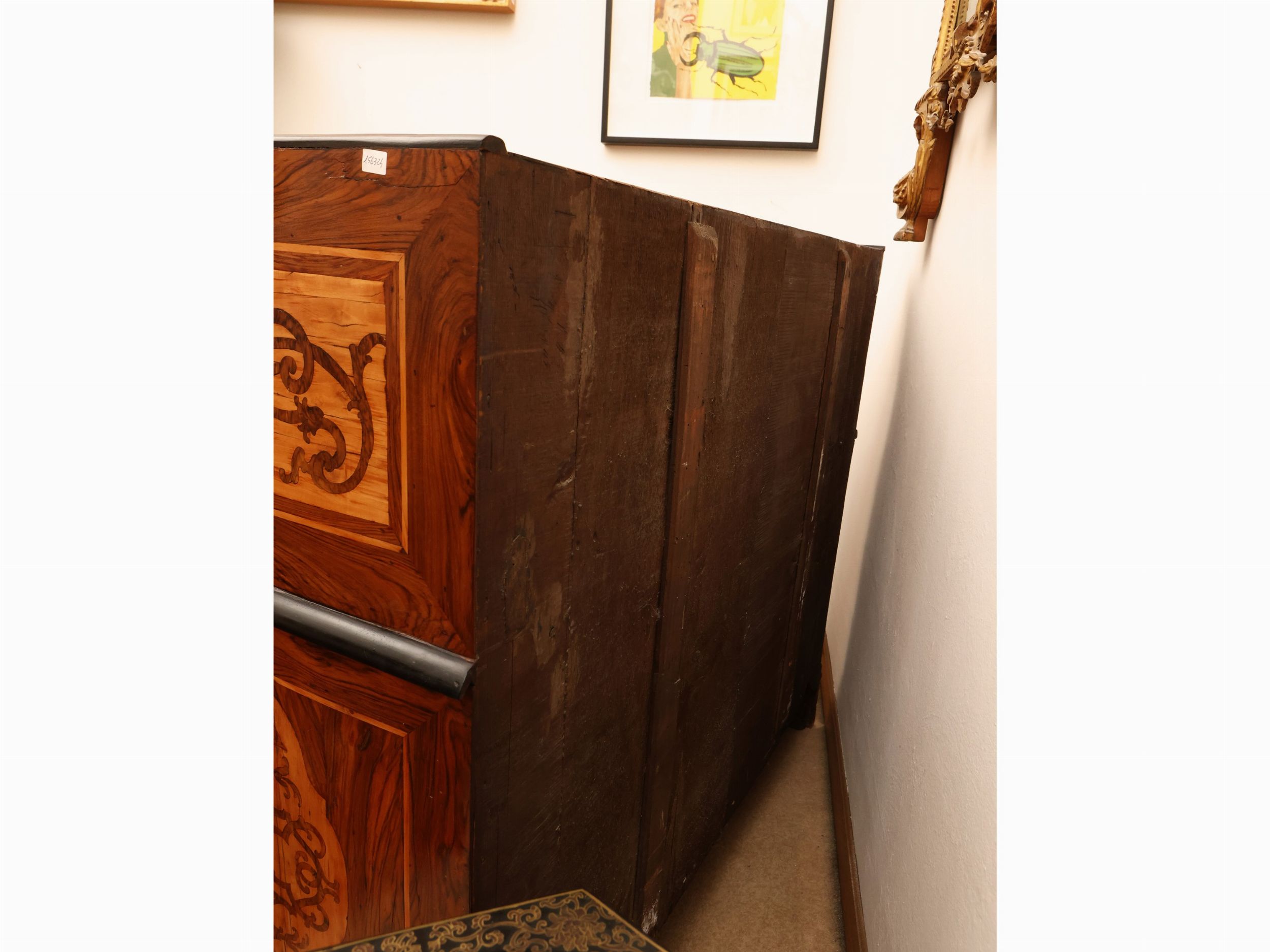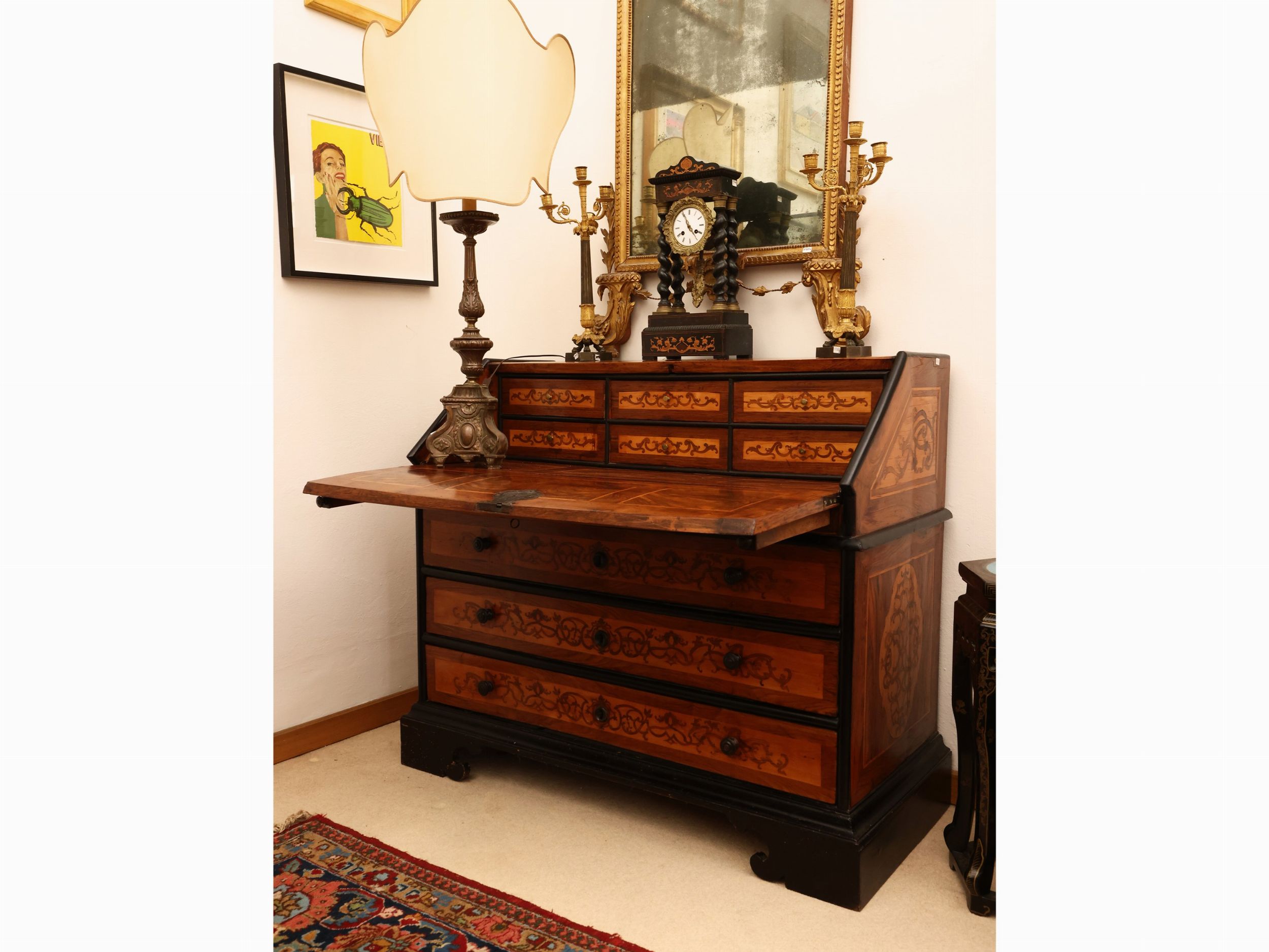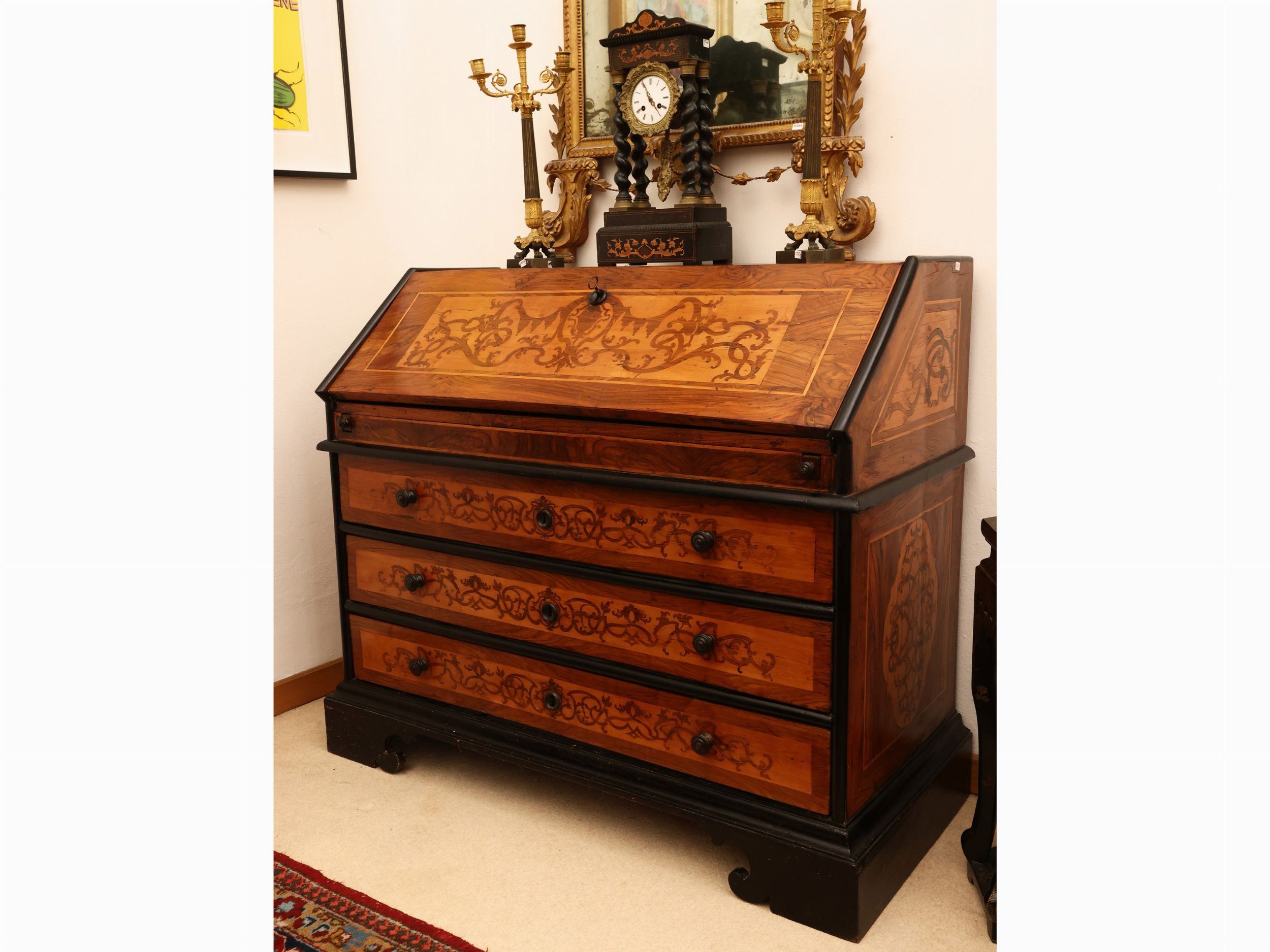 h cm 106x119x55 XIX/XX secolo interamente intarsiato in legni di frutto con volute e girali speculari, dettagli ebanizzati, sportello a calatoio a celare scarabattolo con sei cassettini e vano segreto, tre cassetti sul fronte dritto, piedi a mensola, alcuni difetti