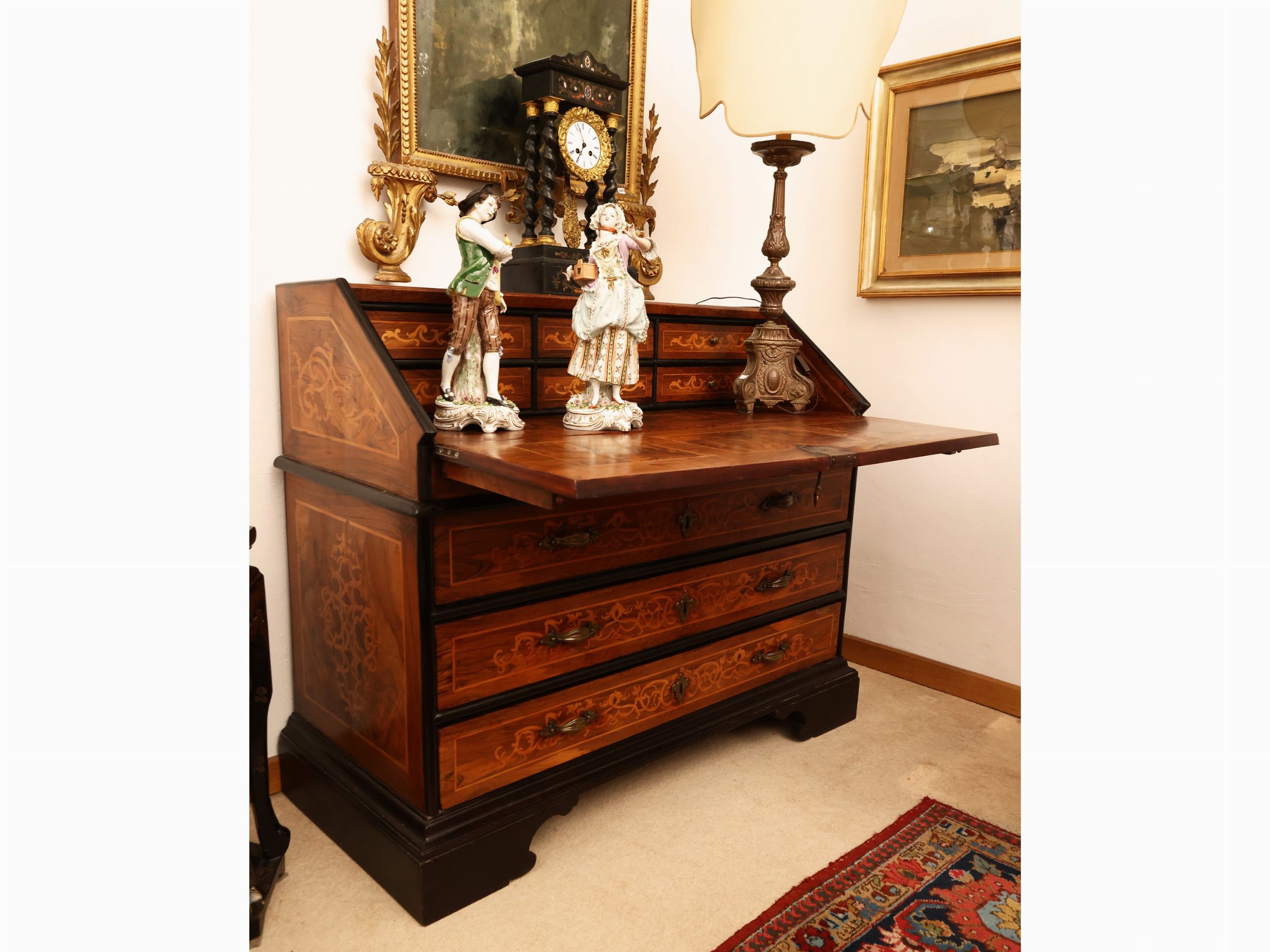 h cm 104x121x56 XIX/XX secolo interamente intarsiato in legni di frutto con volute e girali speculari, dettagli ebanizzati, sportello a calatoio a celare scarabattolo con sei cassettini e vano segreto, tre cassetti sul fronte dritto, piedi a mensola, alcuni difetti