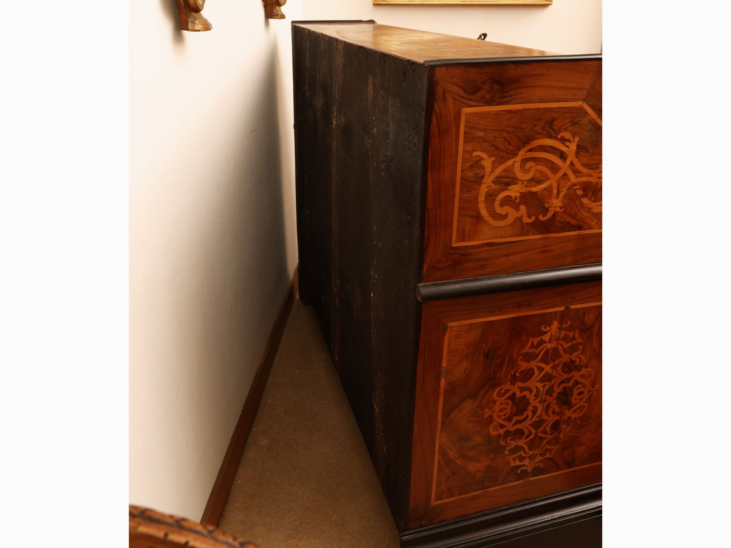 Cassettone a ribalta impiallacciato in noce, facente parte di una coppia