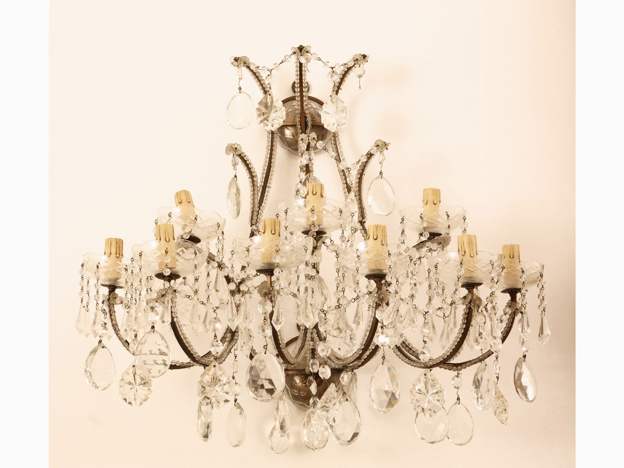 nove bracci portacandele impreziositi da pendenti sfaccettati di varie forme e catene di cristallo, lievi difetti e possibili lievi mancanze