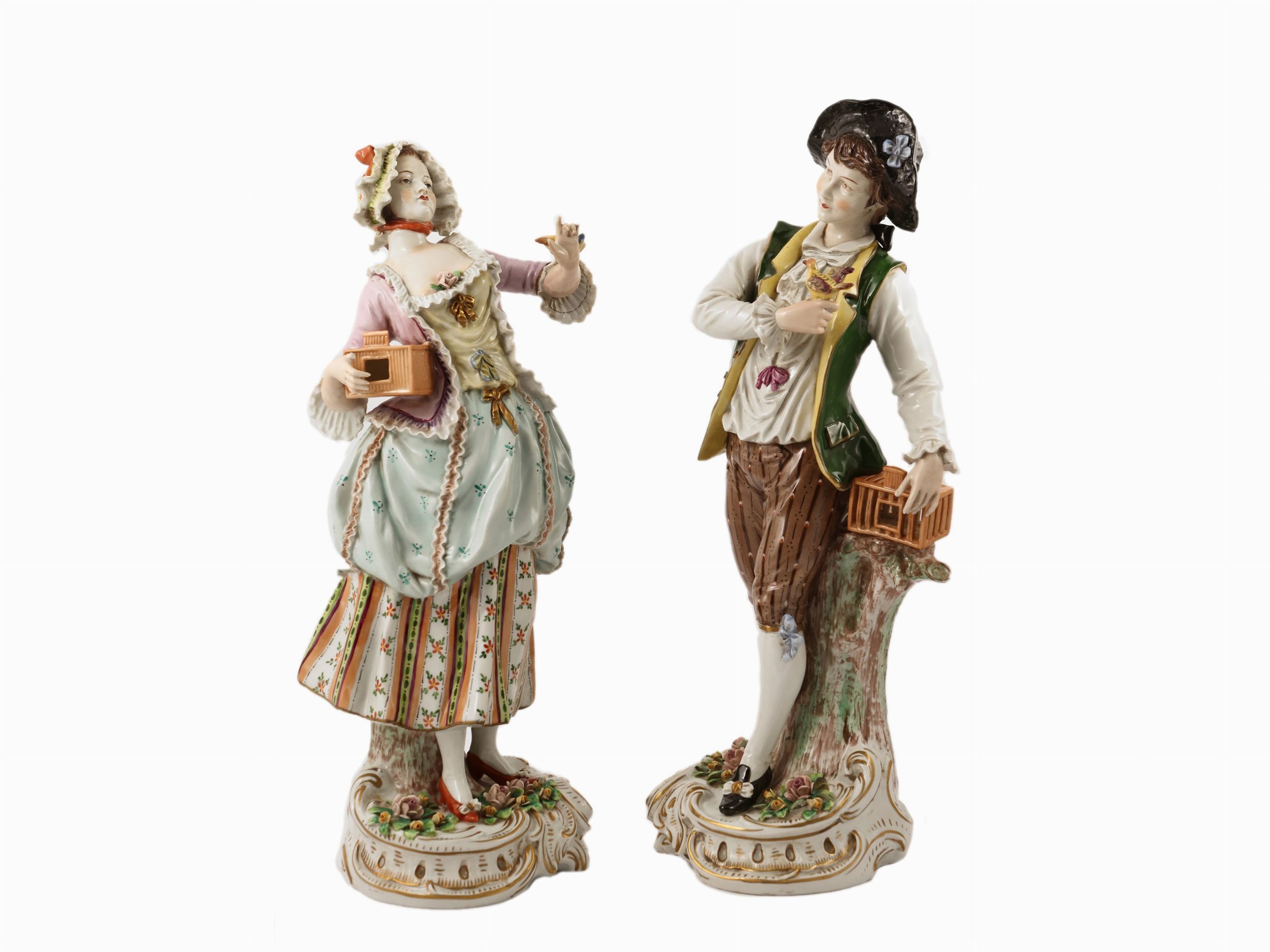 Germania, XX secolo raffiguranti due contadinelli in abiti settecenteschi con volatili e gabbiette