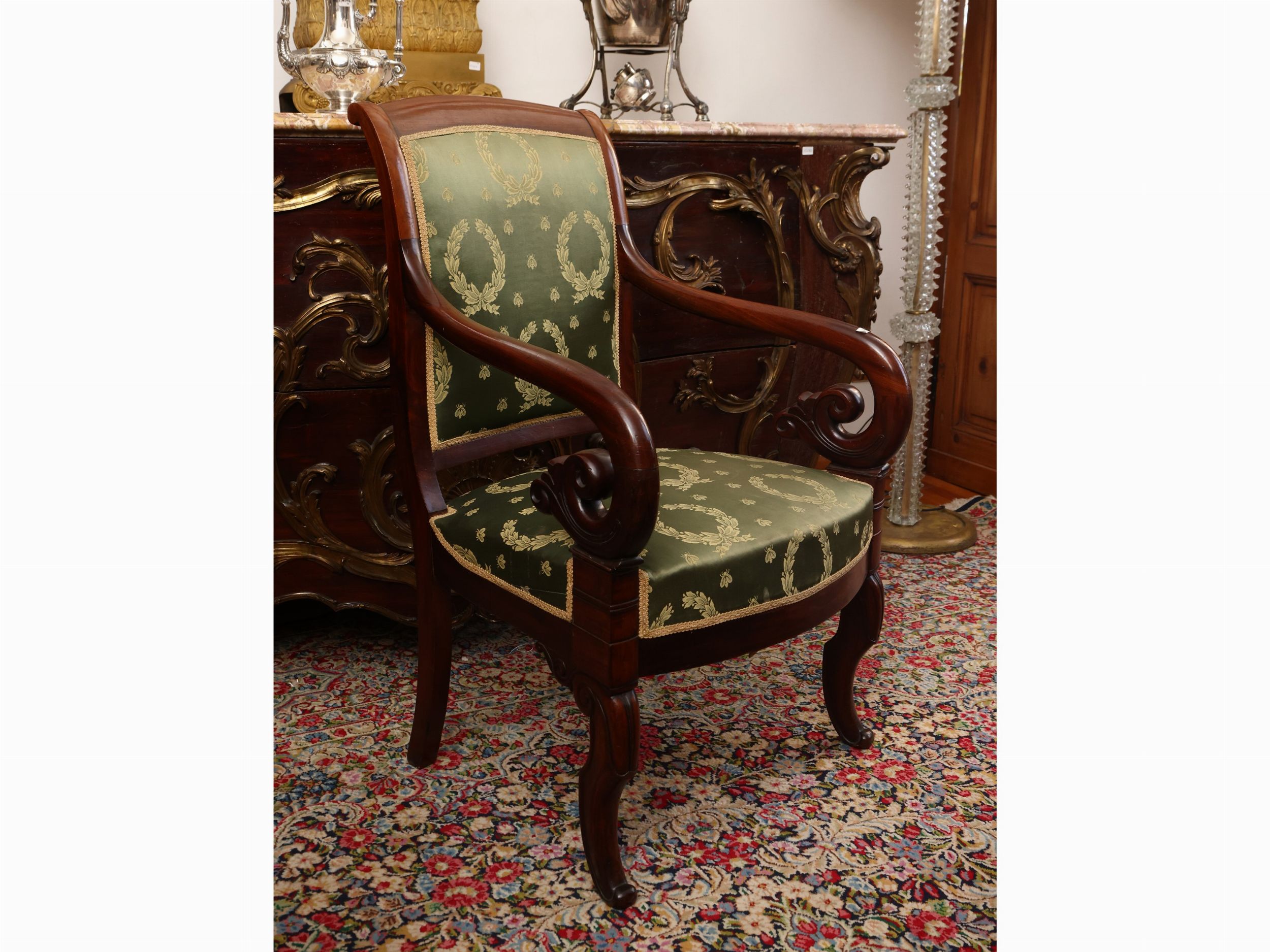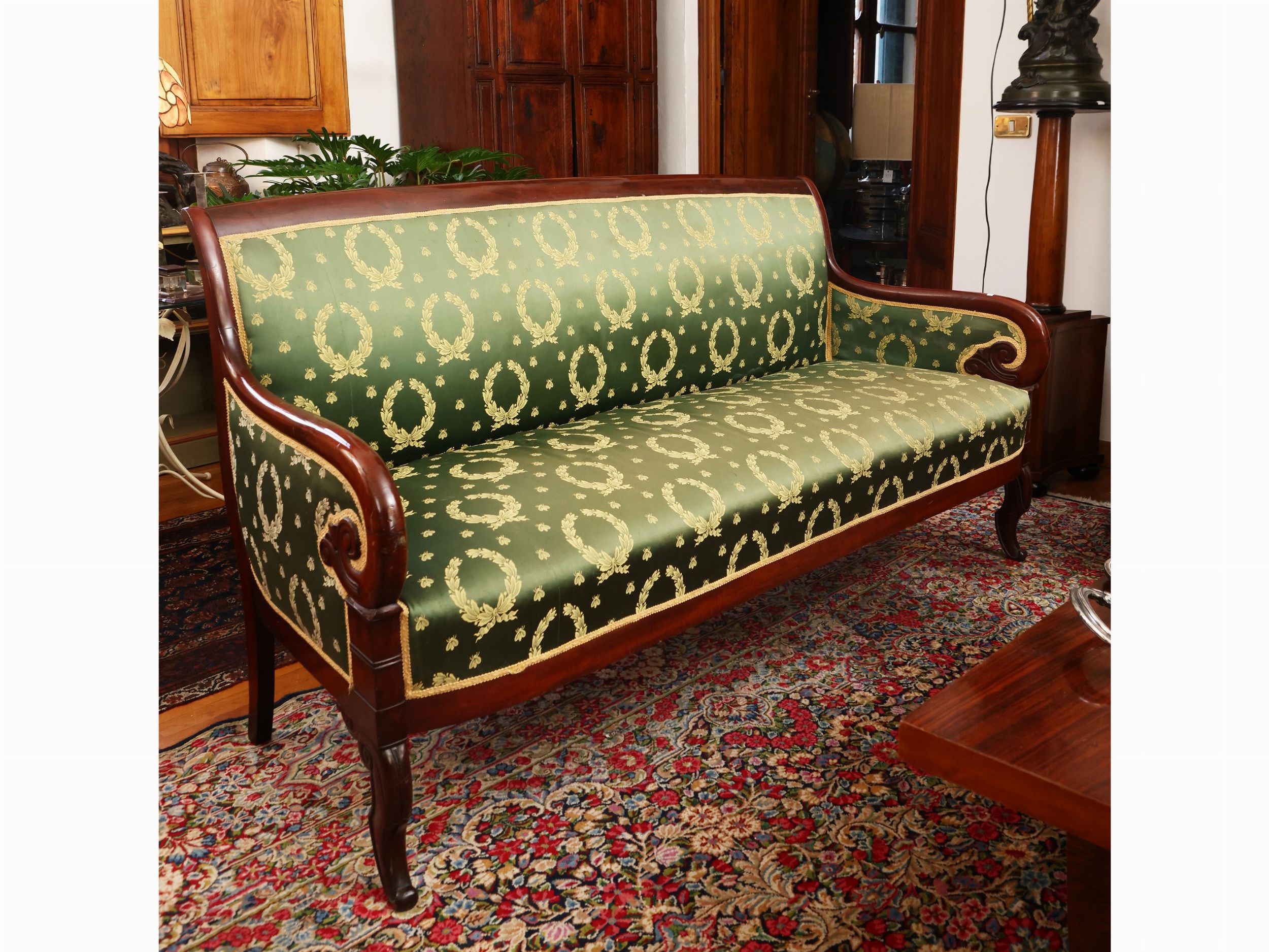 Francia, prima metà del XIX secolo braccioli a grande voluta, gambe anteriori sagomate, le posteriori a sciabola, rivestito in raso verde con motivi impero