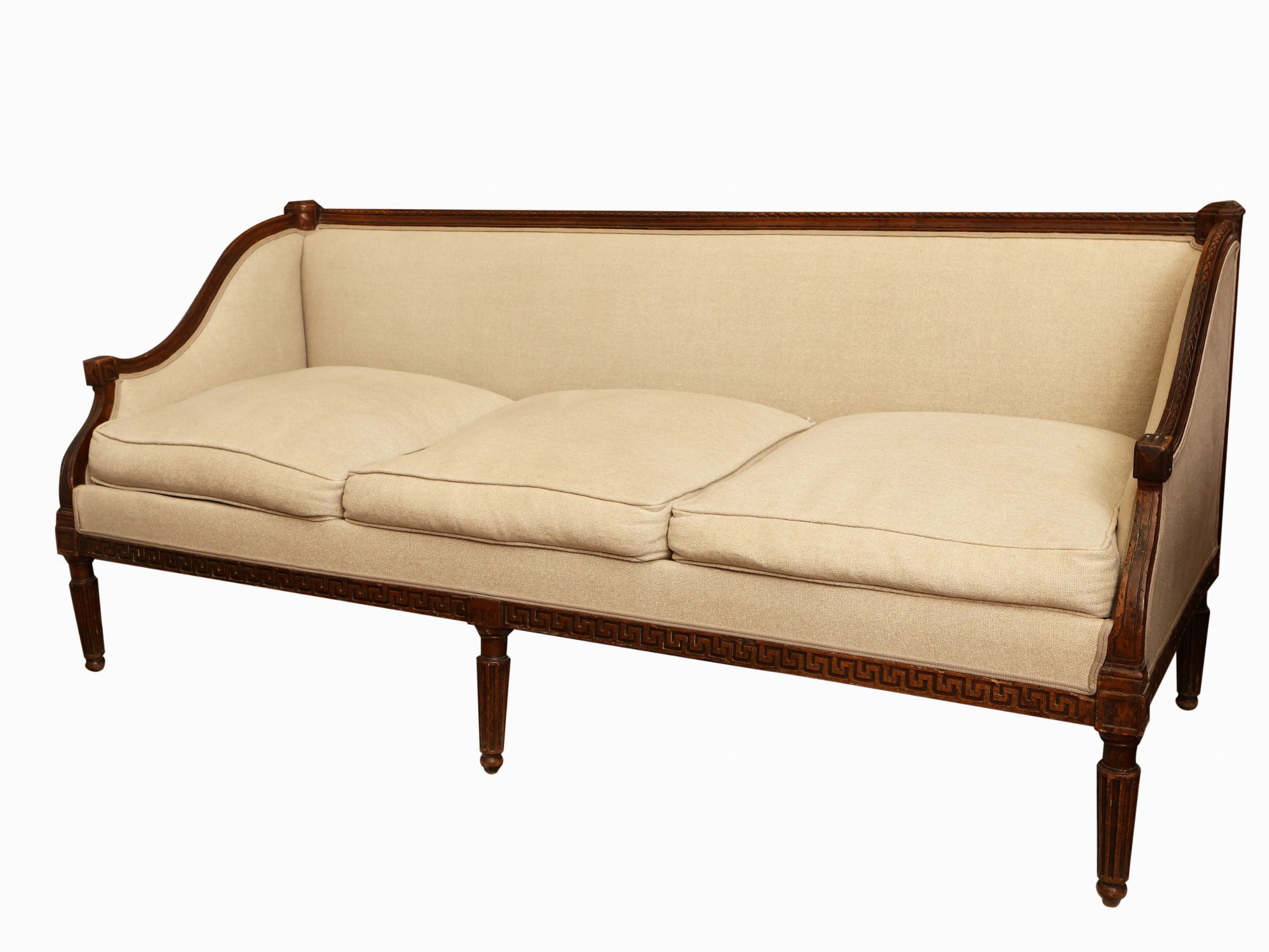 fine del XVIII secolo pendaglina intagliata con motivo a greca, sei gambe scanalate, imbottito e rivestito in tessuto color spago