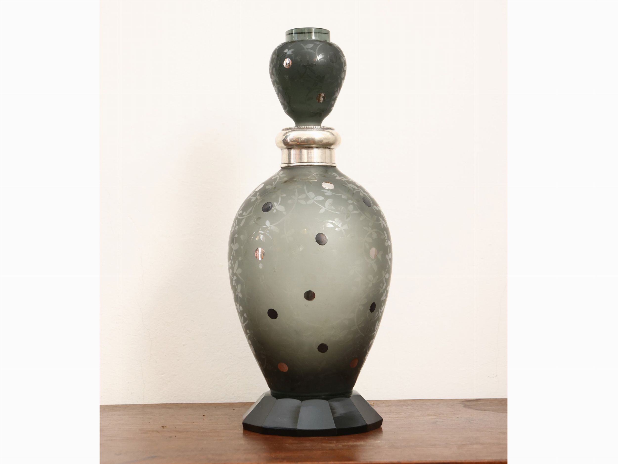 una scatola in vetro molato con coperchio in argento ed una bottiglia da vino in vetro spesso fumé