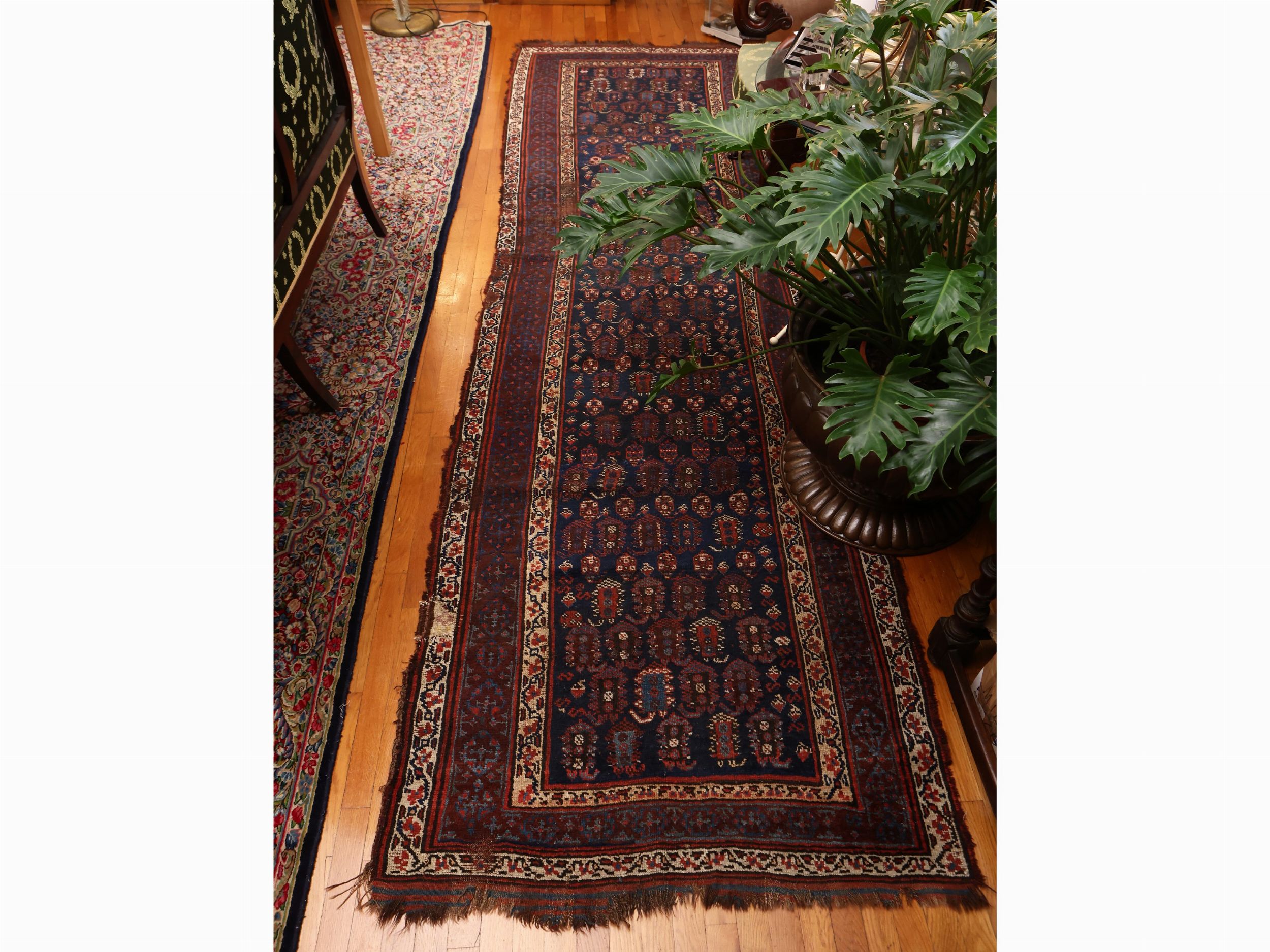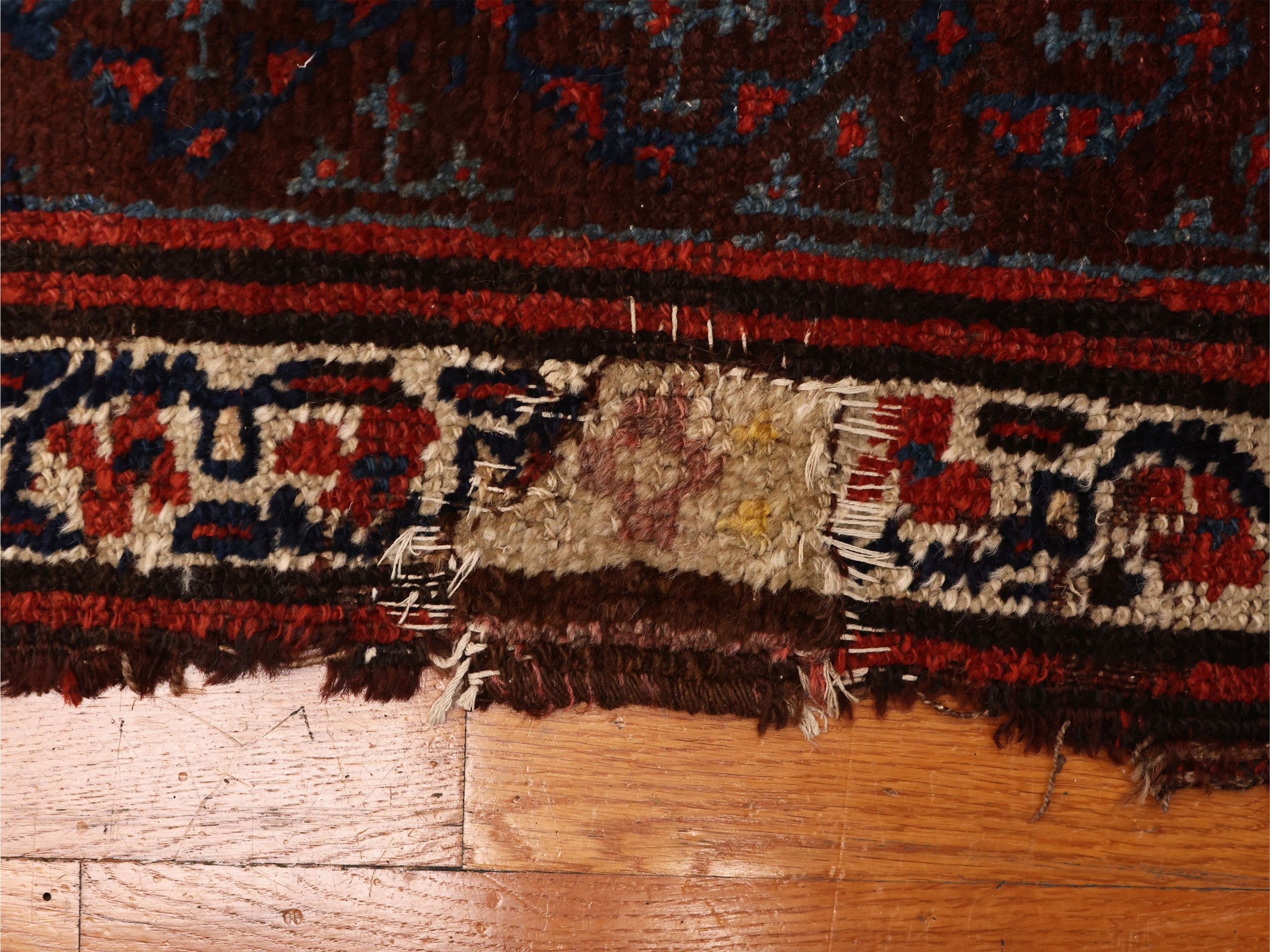 1920 motivo boteh nei toni del beige, azzurro e rosso mattone su fondo blu, difetti