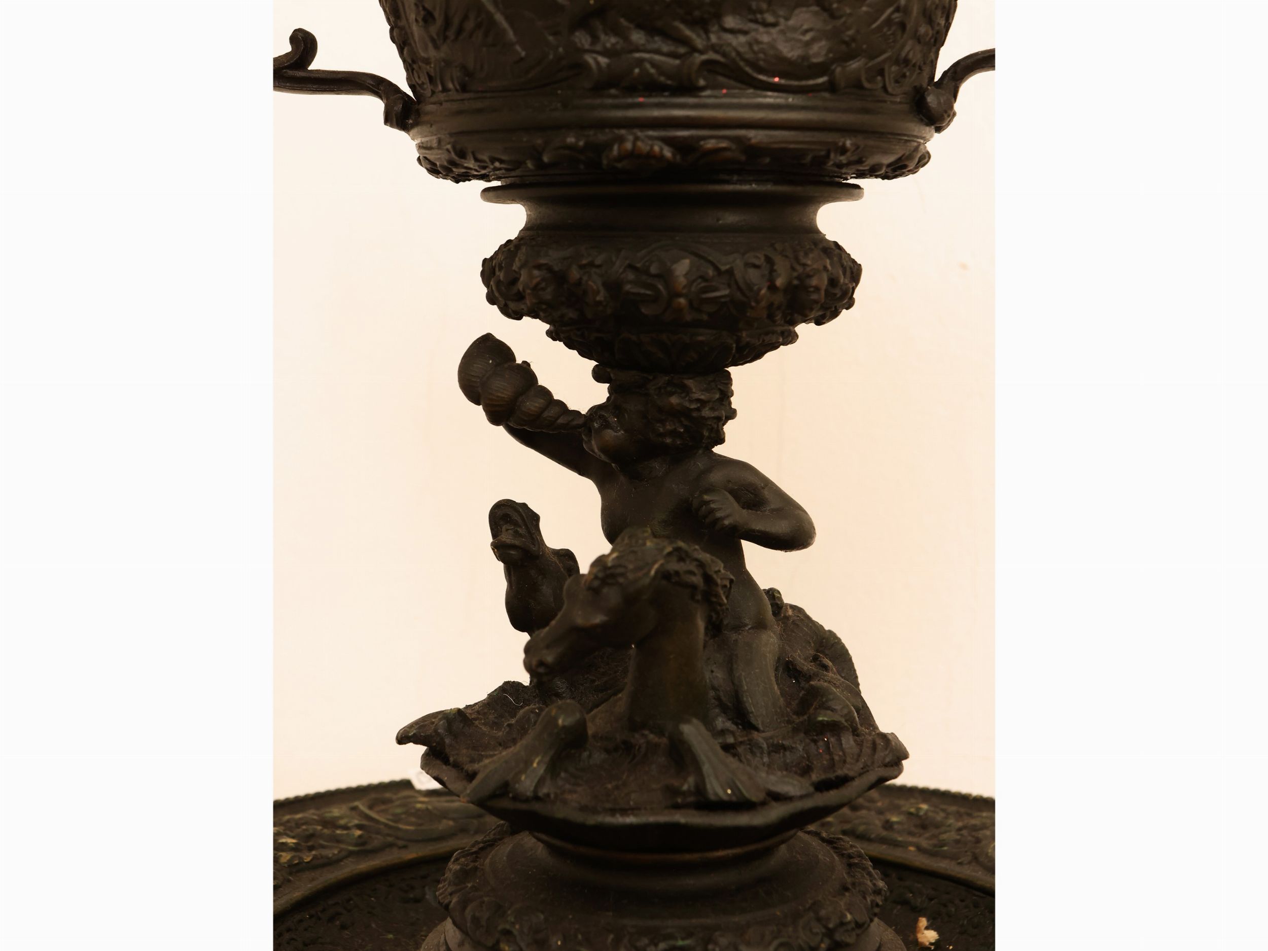 prima metà del XX secolo sormontata da gruppo scultoreo raffigurante la Nascita di Venere, due anse a foggia di cavalli alati, completamente istoriata con scene mitologiche, corredata da vassoio en pendant