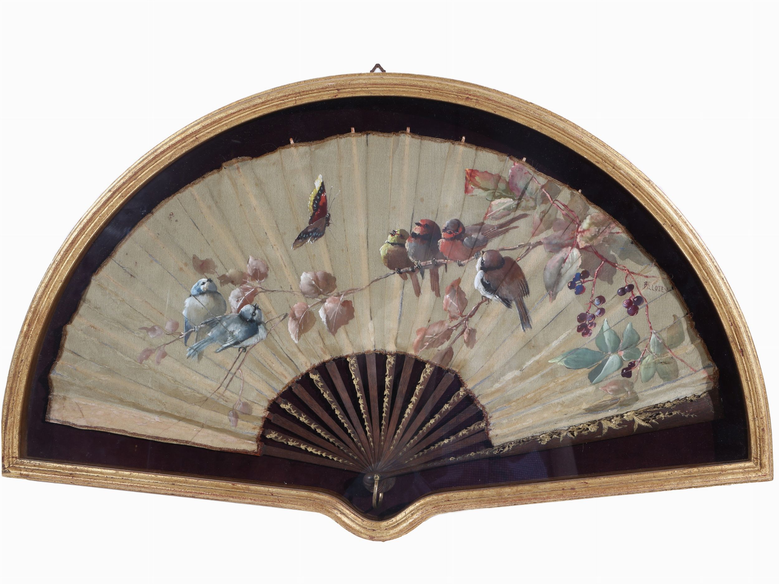cm 34x65 fine del XIX secolo pagina in seta dipinta con motivo di piccoli volatili, farfalle e tralcio di bacche di gusto Art Nouveau, firmata, stecche in legno intagliate con racemi floreali e lumeggiature dorate, entro cornice a teca, lievi difetti (anche al vetro della cornice)