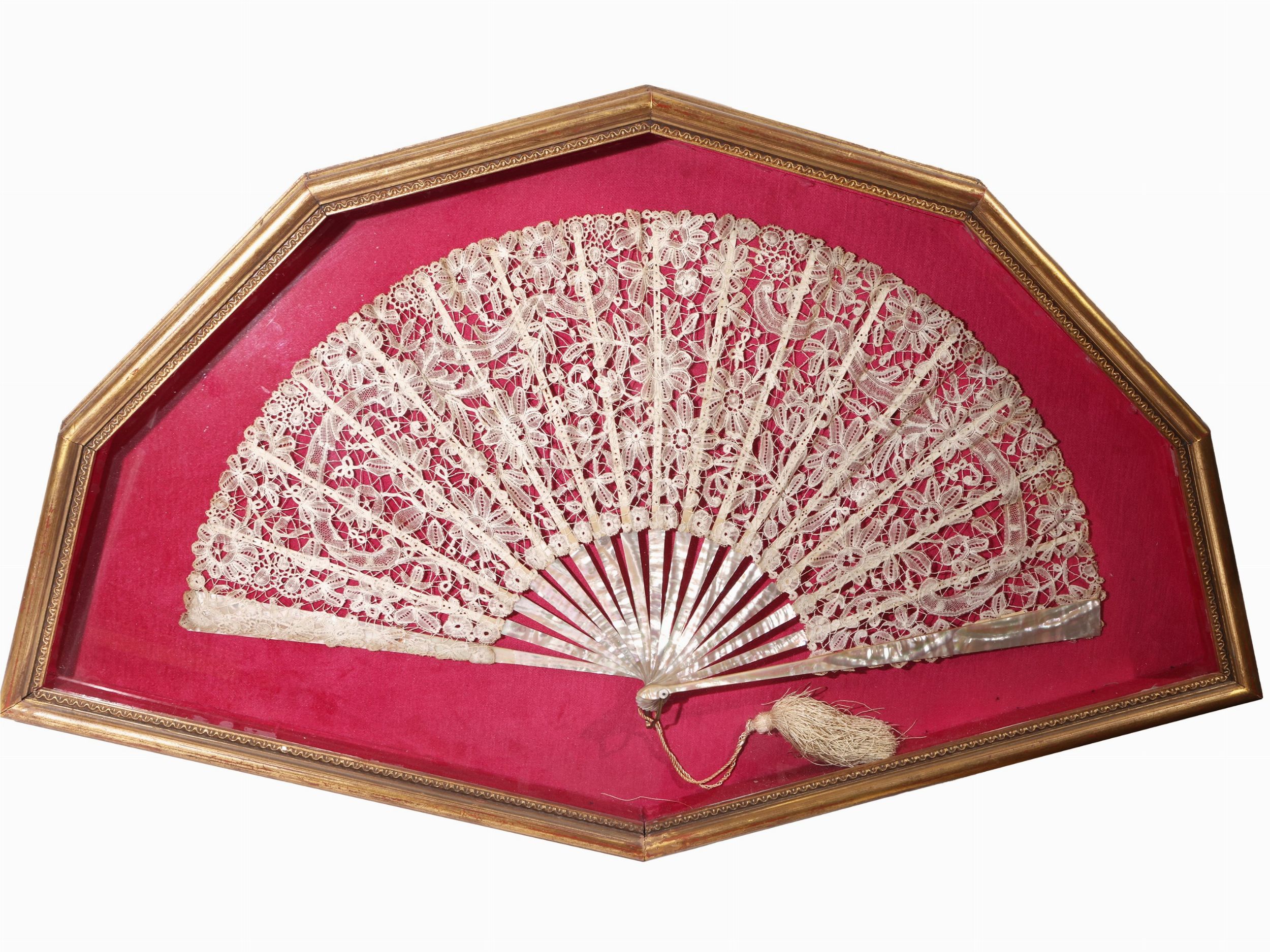 inizio del XIX secolo pagina realizzata in pizzo a fuselli con motivo floreale, stecche in madreperla, finale con nappa, entro cornice a teca