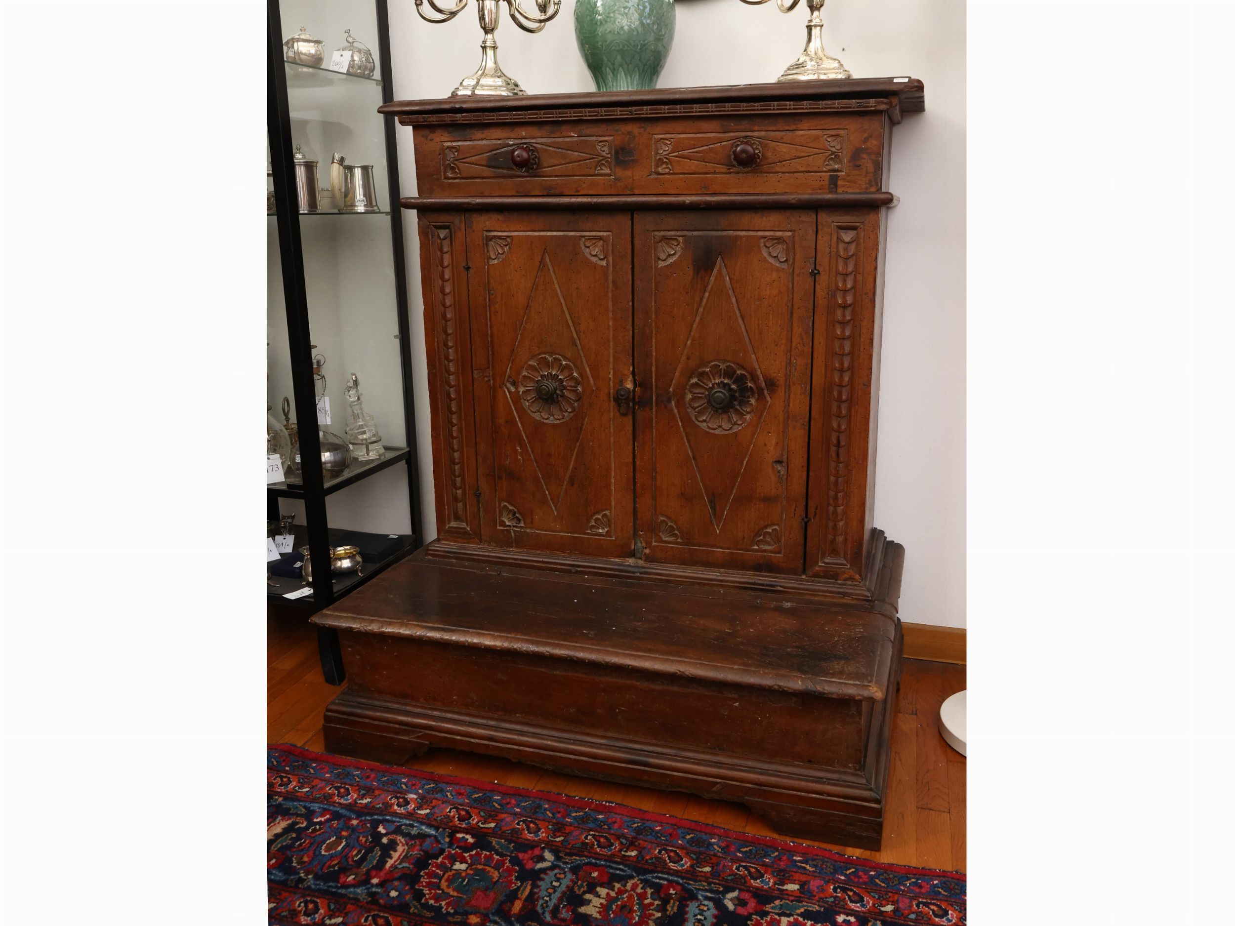 XVII secolo un cassetto e due sportelli intagliati con cornici a losanga sul fronte, piedi a mensola, alcuni difetti