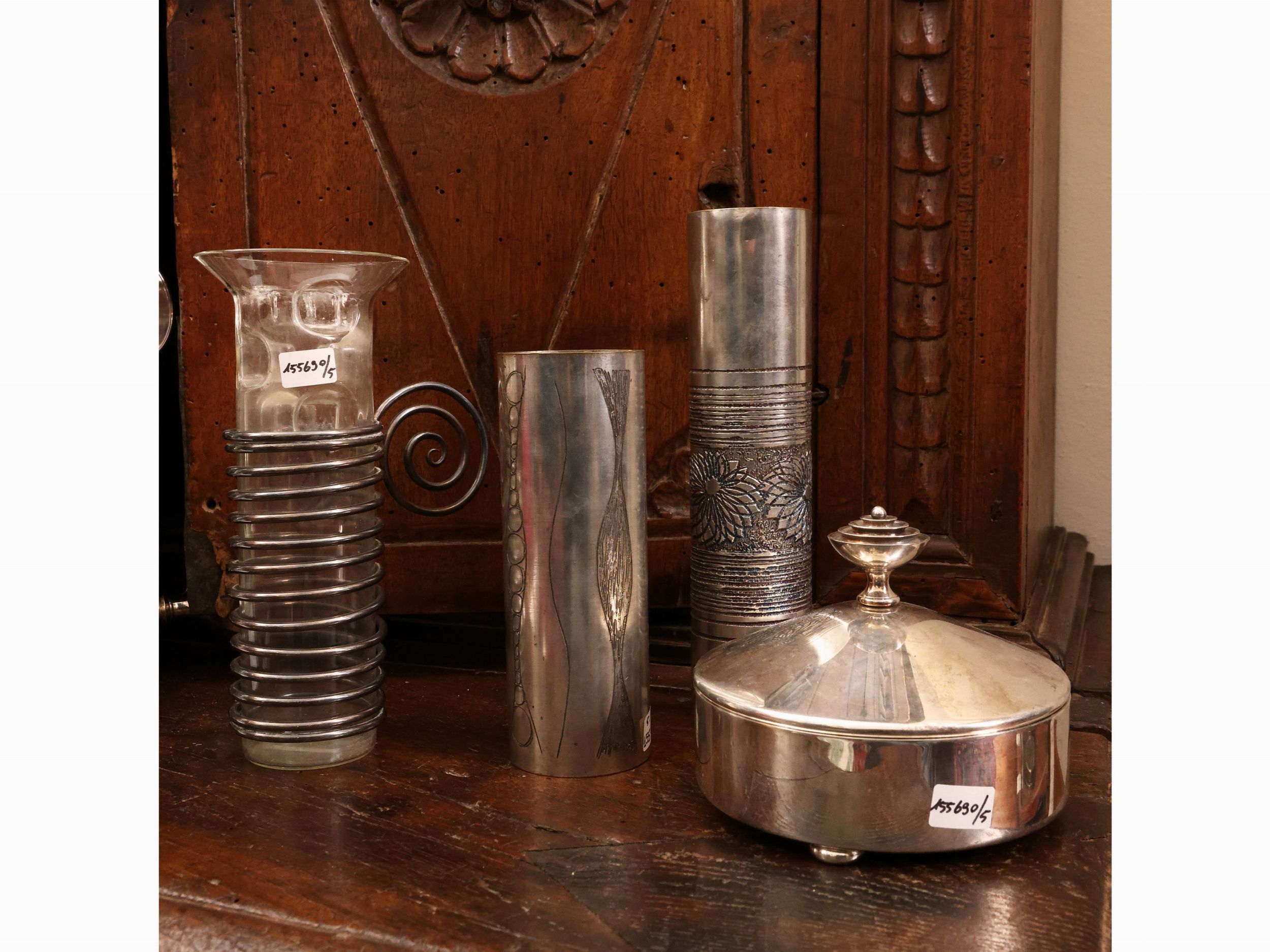 Anni Settanta un volatile in vetro soffiato a reticello ed una serie di vasi e complementi in metallo