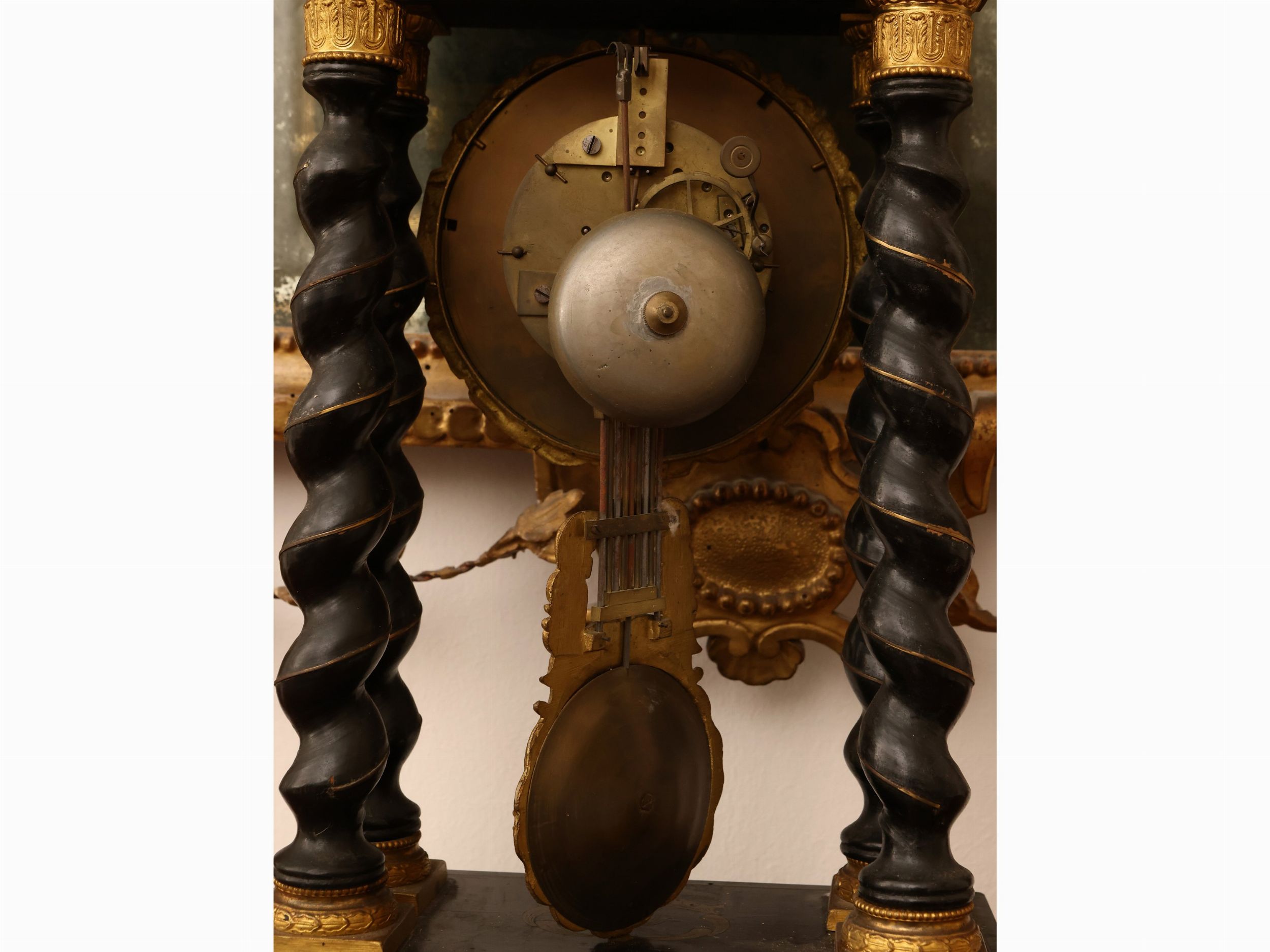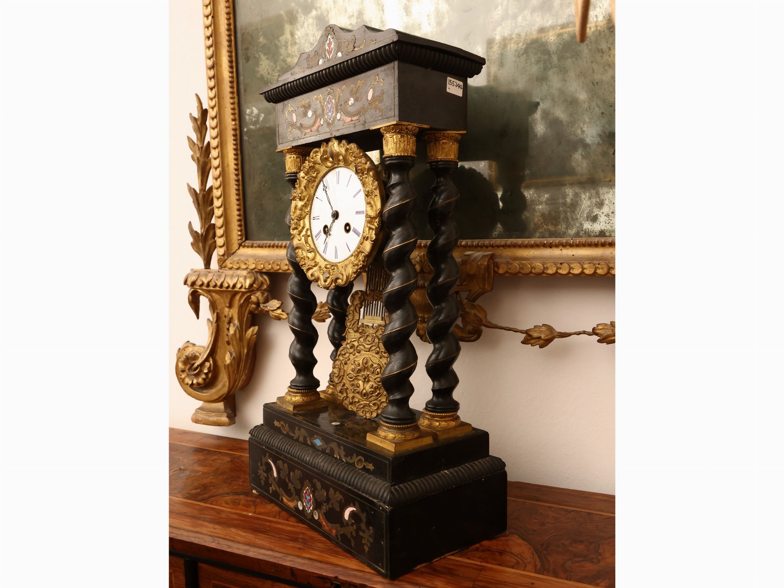 seconda metà del XIX secolo intarsiato in metallo in parte smaltato, lesene tortili con capitelli in bronzo dorato, quadrante con numeri romani, alcuni difetti