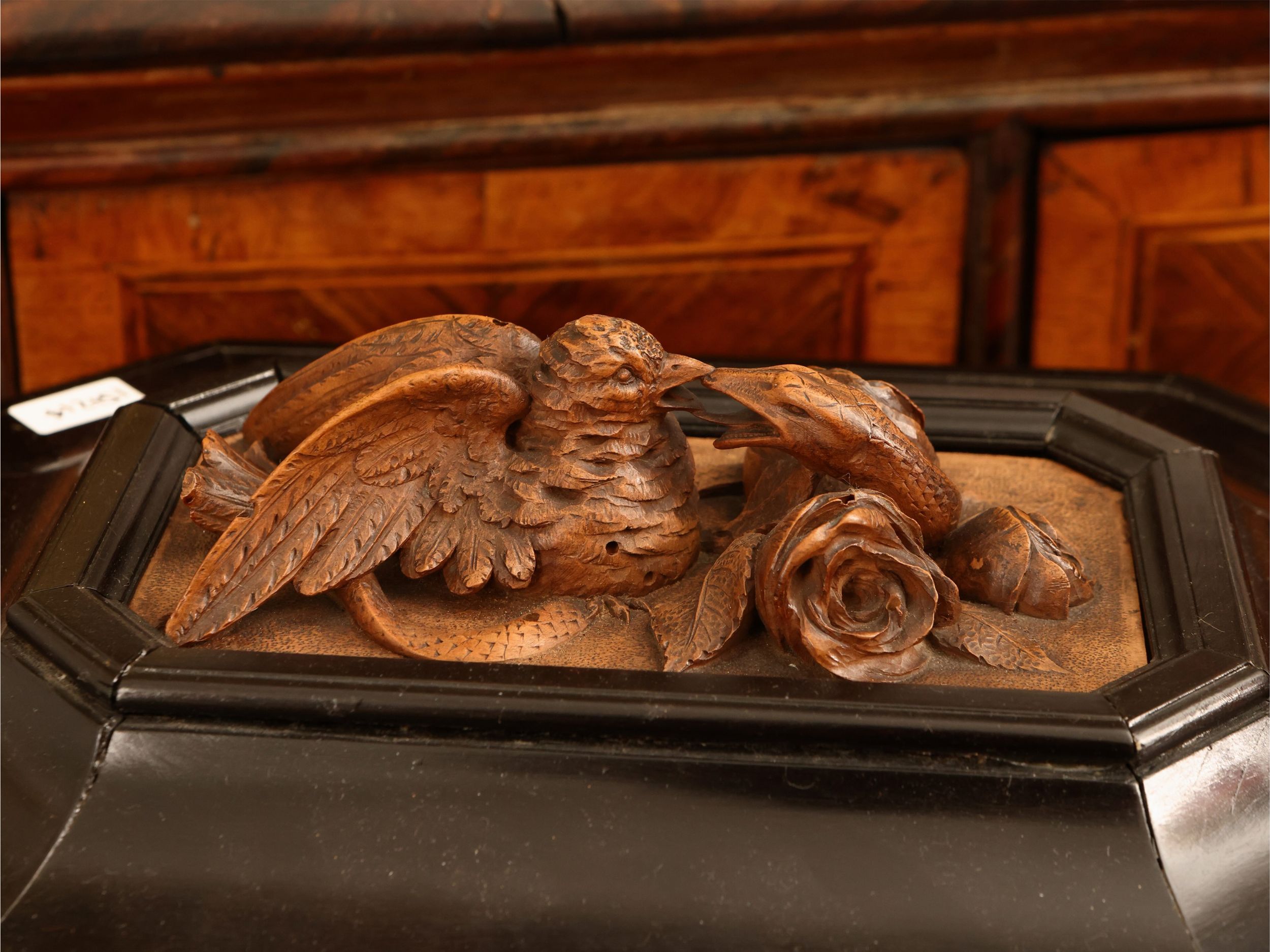 Firenze, fine del XIX secolo angoli scantonati, coperchio scolpito con altorilievo raffigurante volatili, formelle laterali intagliate a bassorilievo a raffellesche