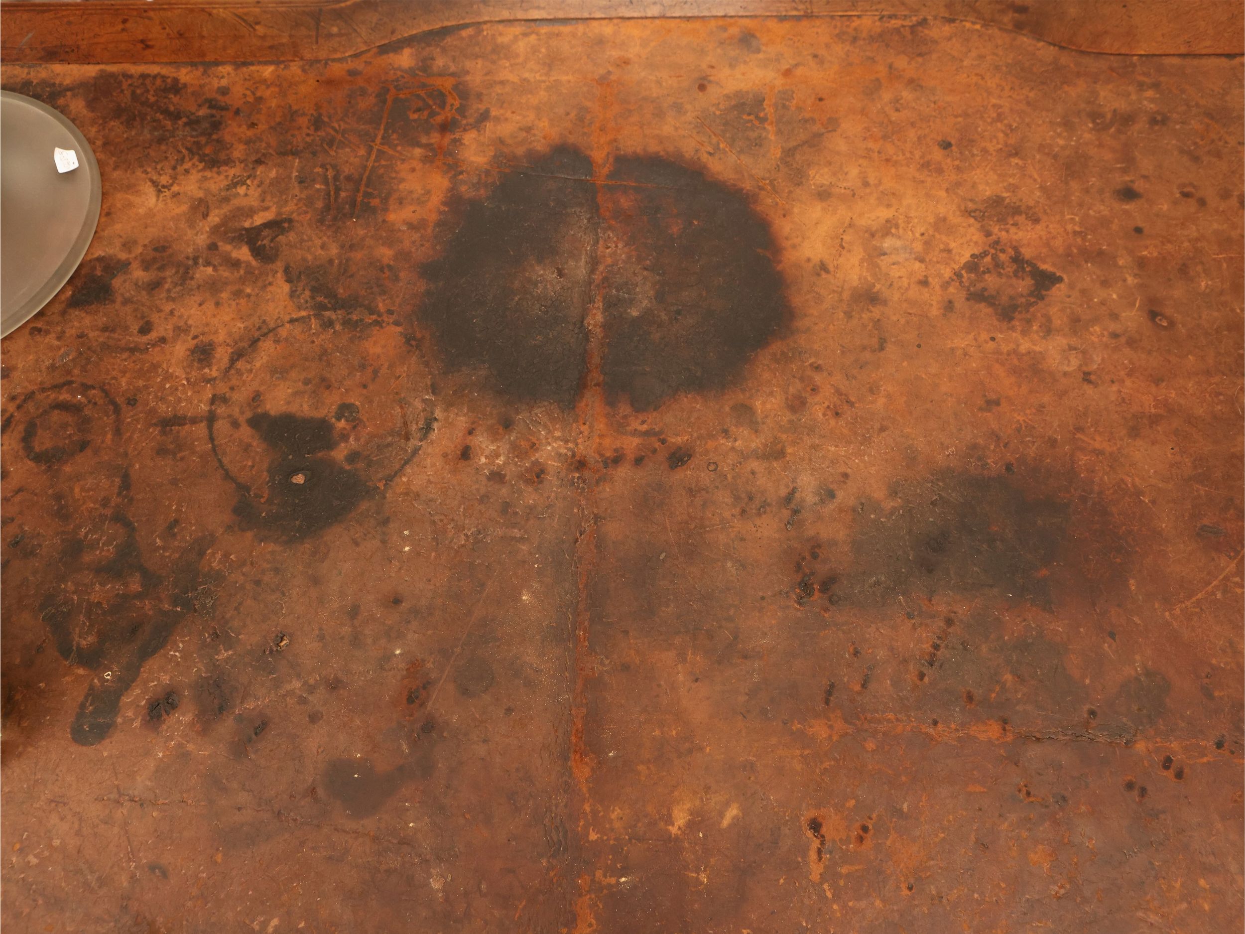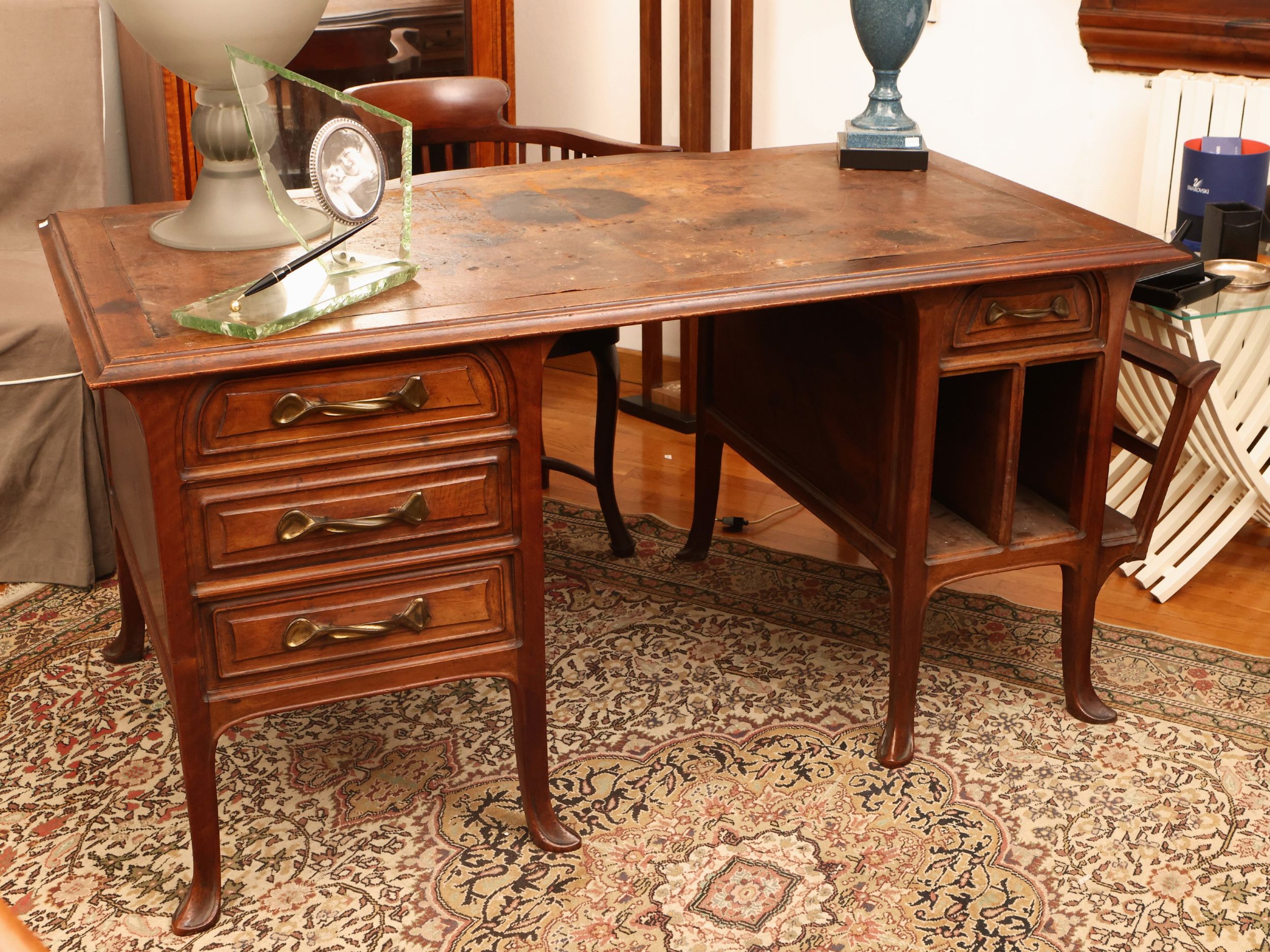 h cm 75x10x82 inizio del XX secolo piano rivestito in cuoio, tre cassetti a sinistra ed un cassetto con vani portacarte sottostanti a destra da entrambi i lati, otto gambe a sciabola con piede a padella, da un lato porta cartelle o riviste, firmata A. Landry