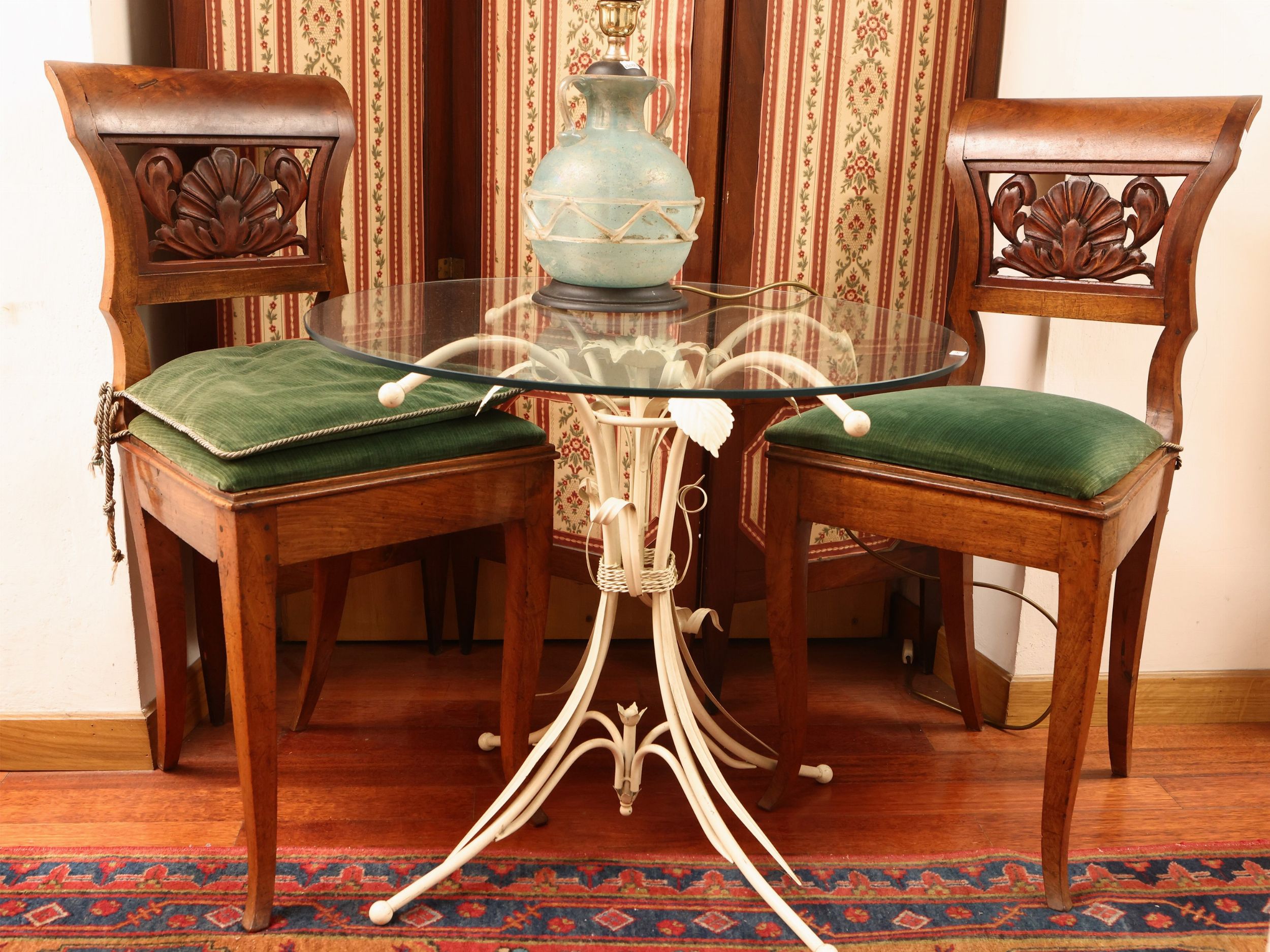 prima metà del XIX secolo schienale sagomato con cartella intagliata e traforata con motivo a conchiglia tra volute, gambe a sciabola, sedili rivestiti in velluto verde con cuscino en pendant