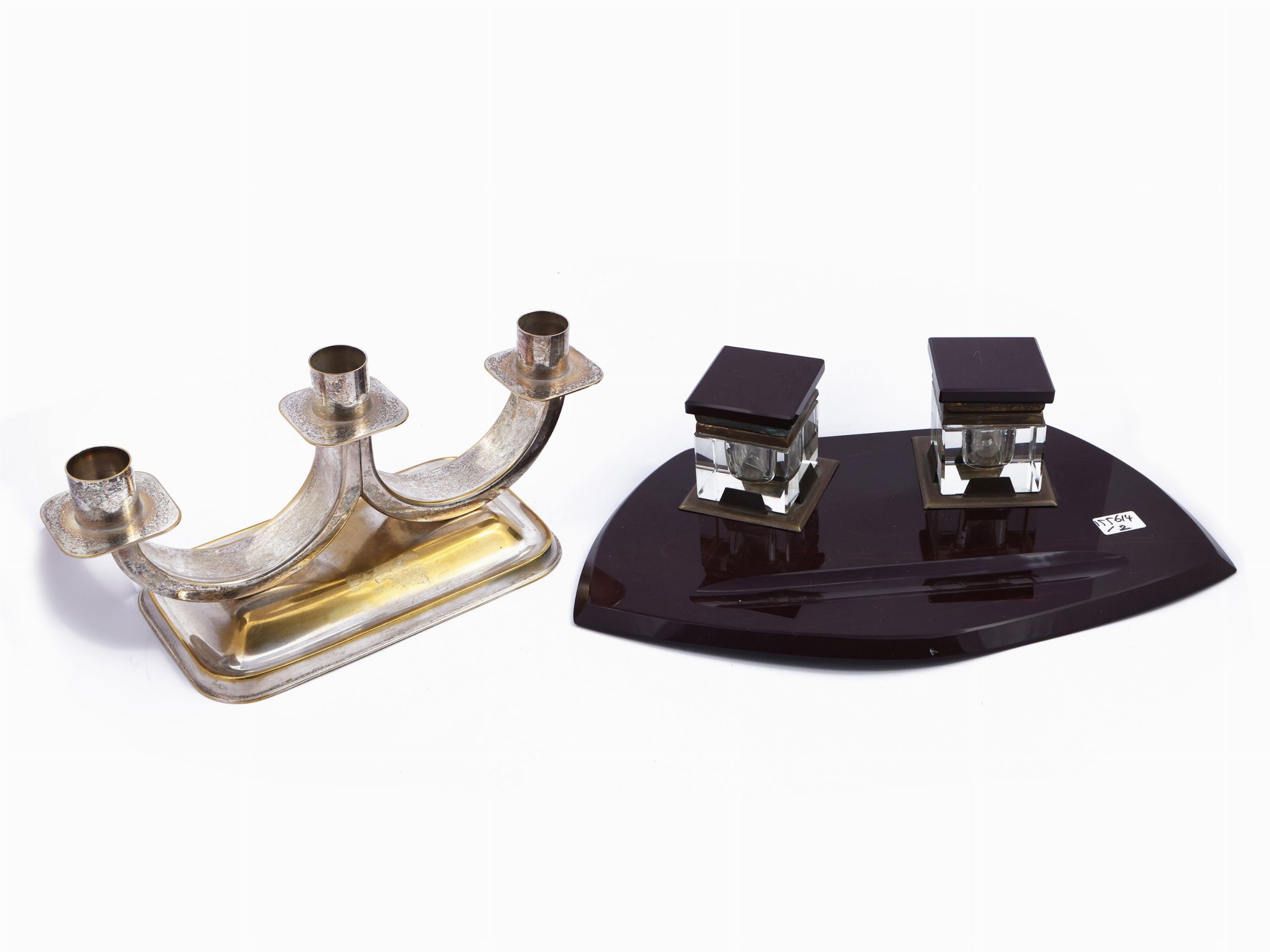 prima metà del XX secolo composto da doppio calamaio in mogano e cristallo e candelabro a tre luci