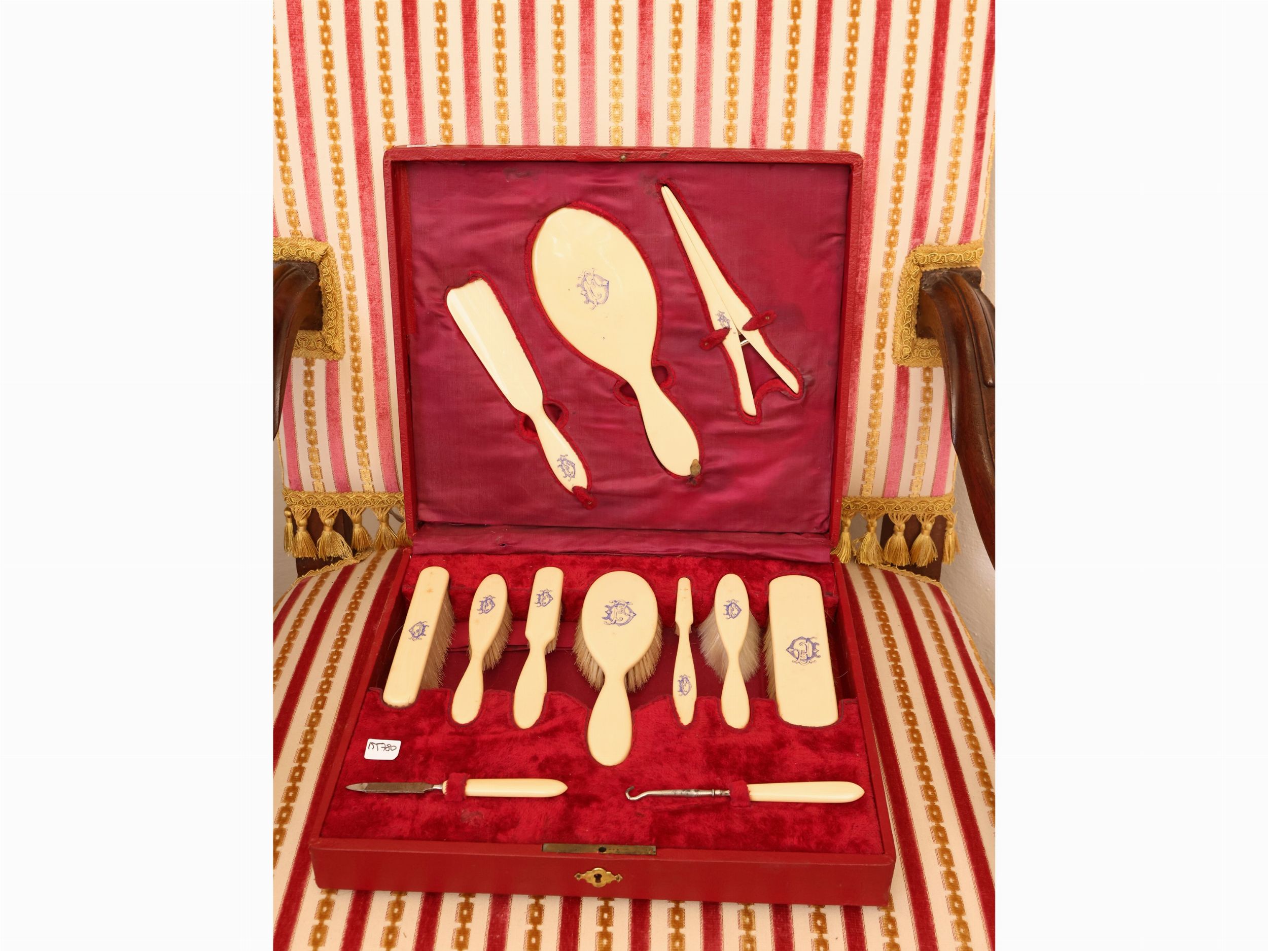 inizio del XX secolo con assortimento di spazzole, specchio a mano ed accessori entro scatola originale, alcuni difetti alla scatola