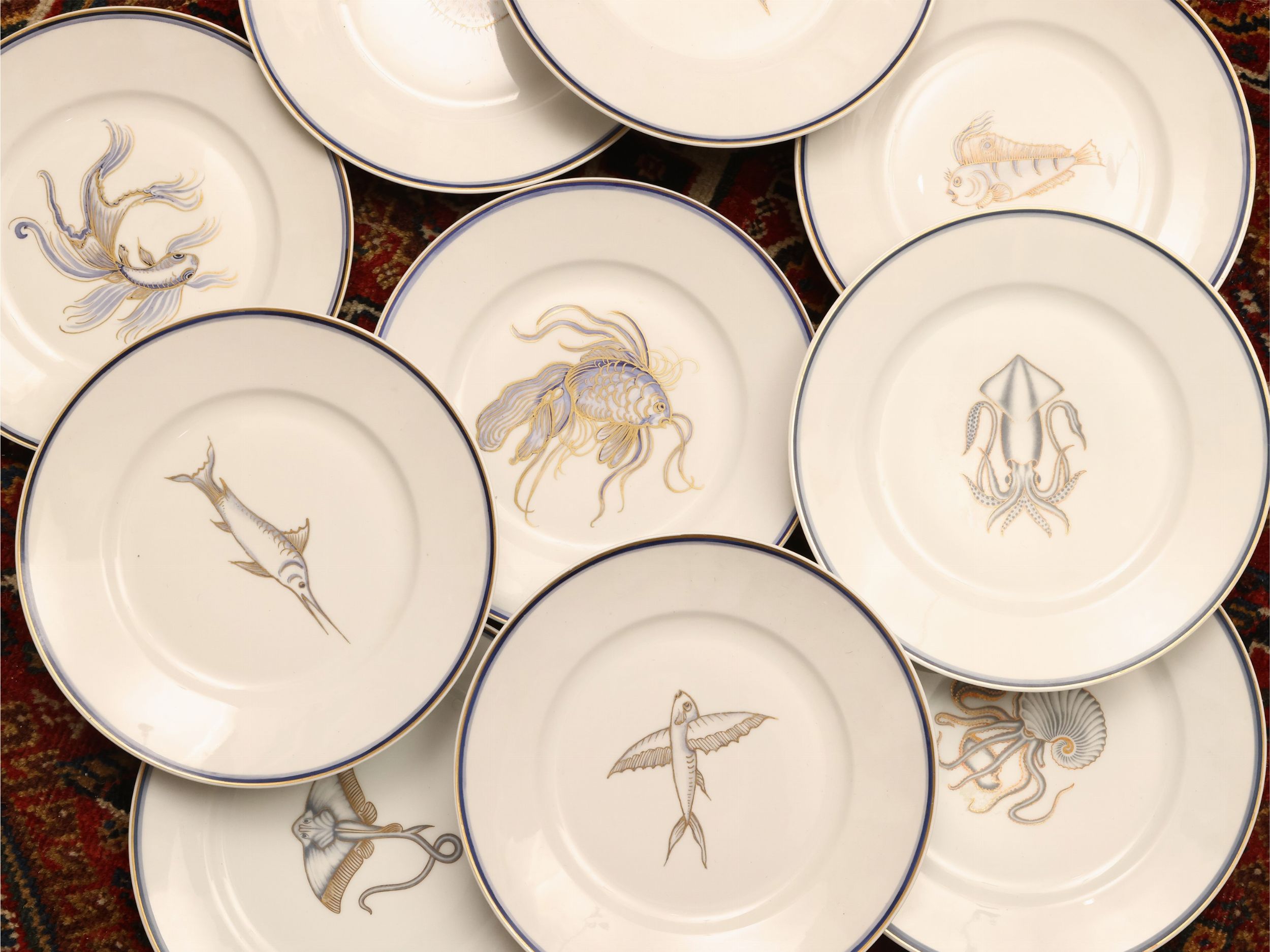 Anni Trenta dipinti con varie tipologie di pesci e crostacei in monocromia azzurra con lumeggiature dorate, la serie Laveno composta da 13 piatti (uno con difetto), quella Ginori da 11 piatti (24)