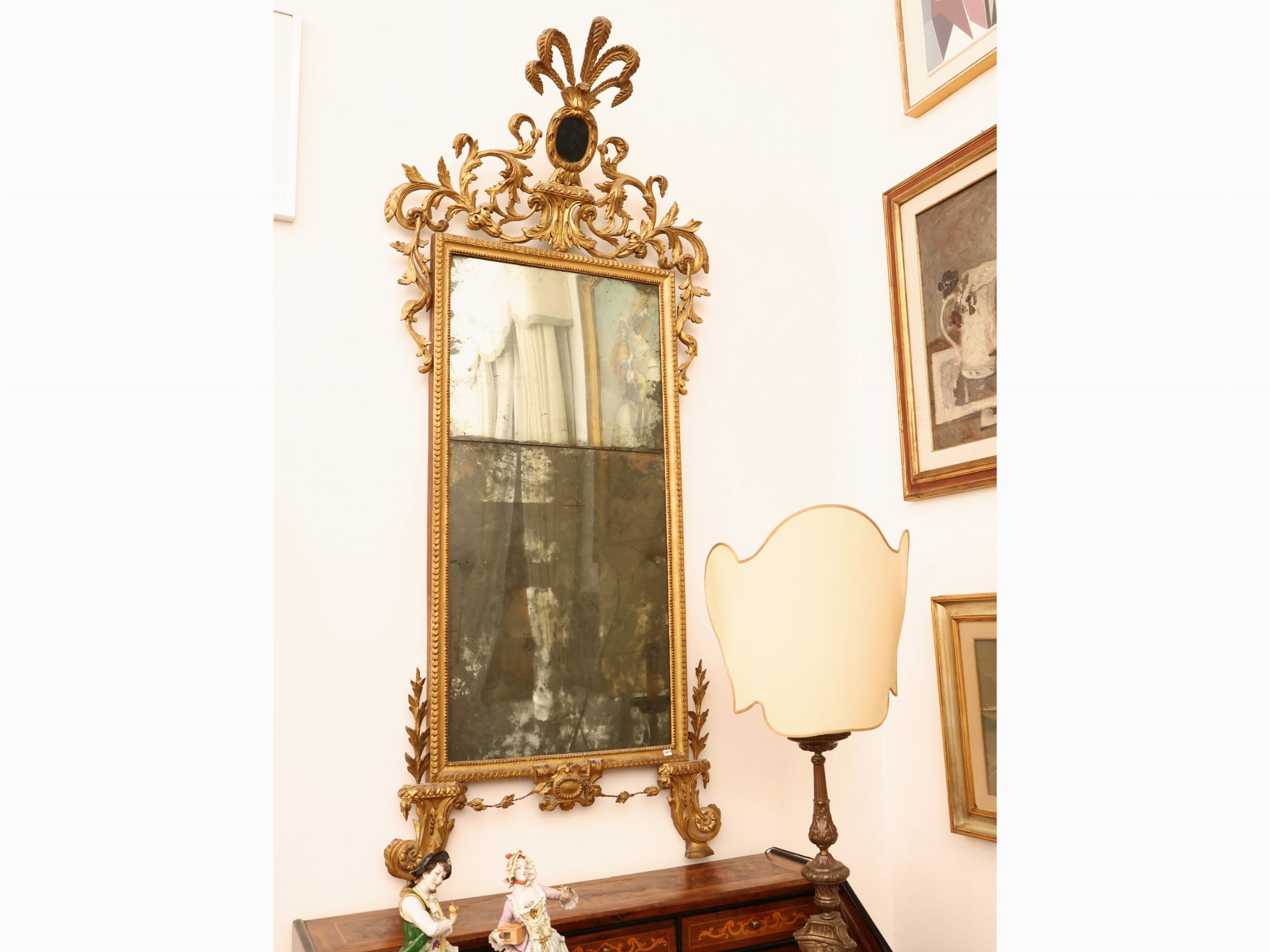 Specchiera con cornice in legno intagliato e dorato facente parte di una coppia