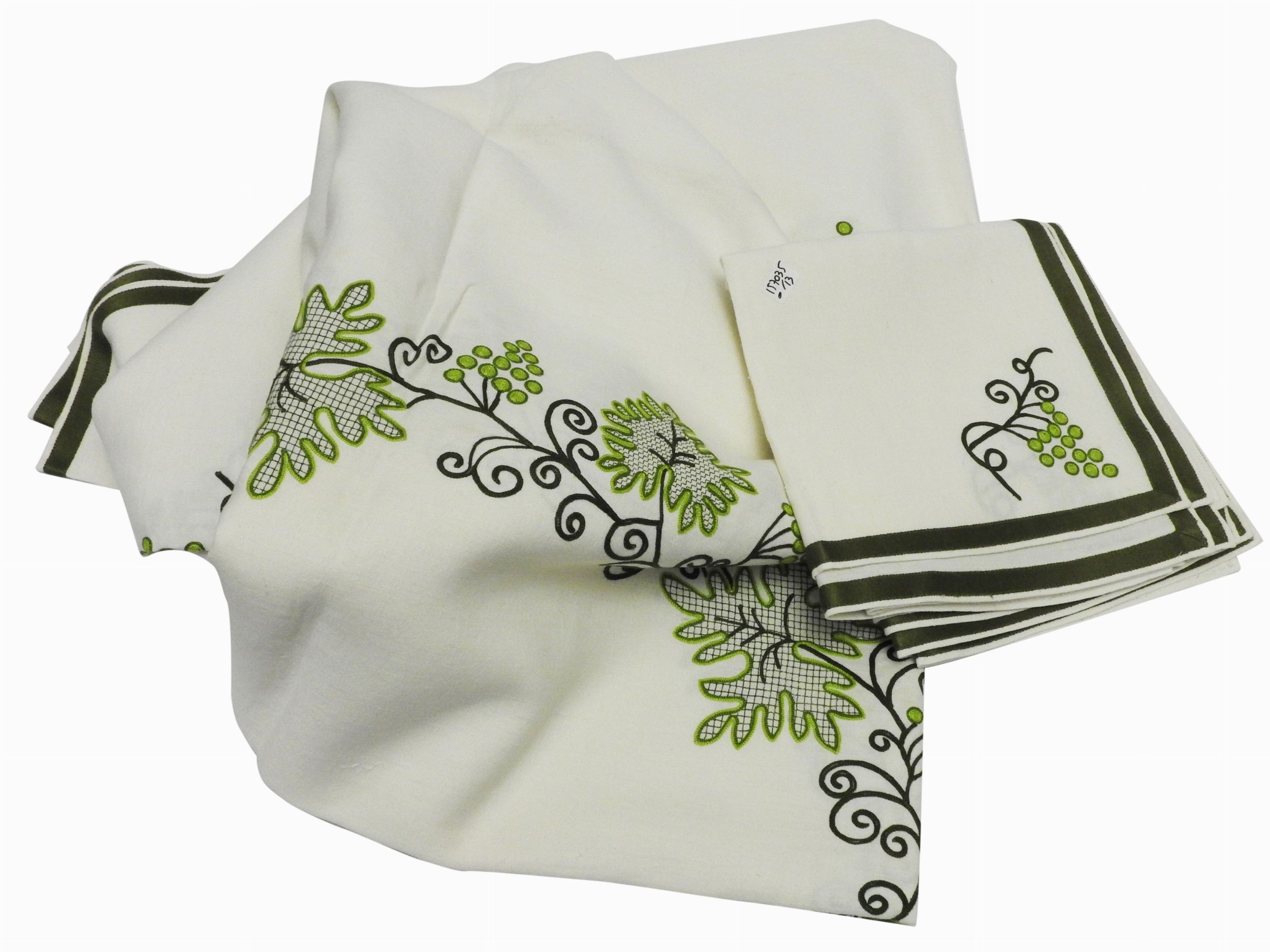 Firenze, prima metà del XX secolo ricamata nei toni del verde con motivo di tralci e grappoli di uva, corredata da 12 tovaglioli