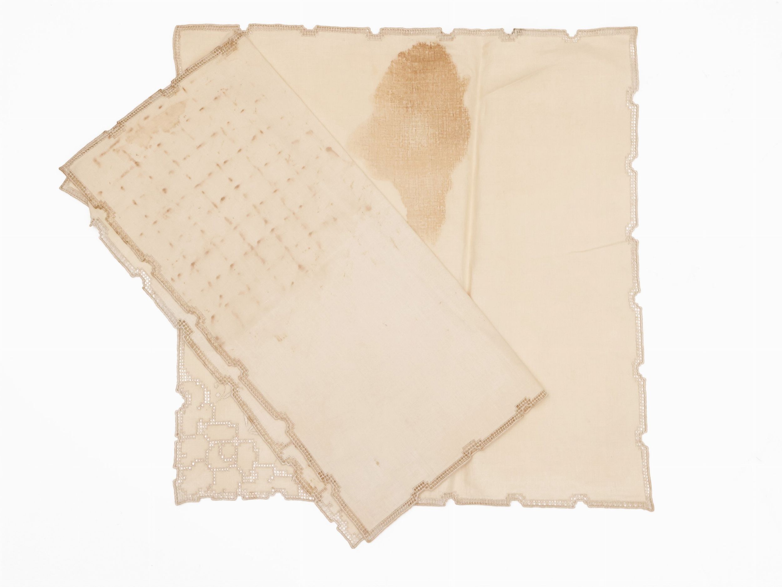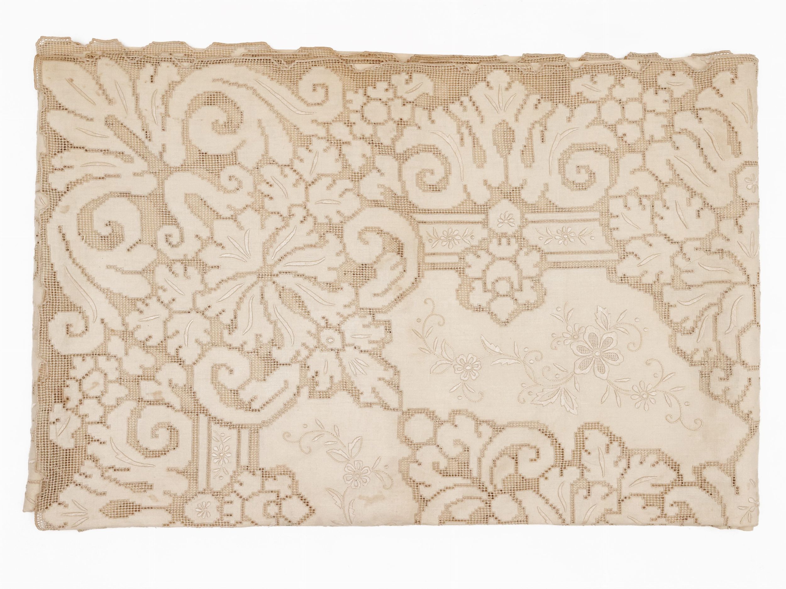 ricamata con la tecnica dello sfilato siciliano, alcune macchie, corredata da 10 tovaglioli
