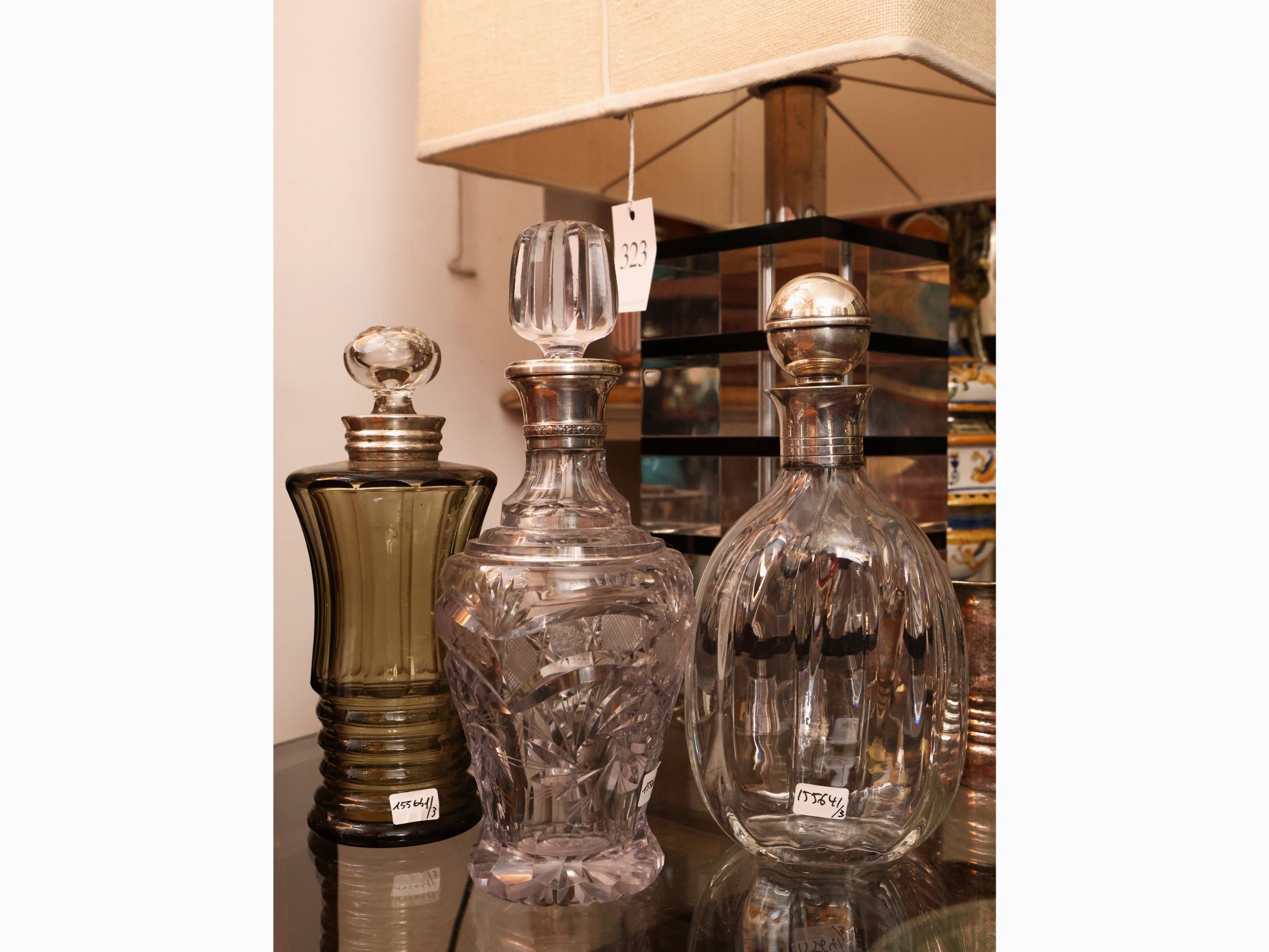 Tre bottiglie da vino in vetro e cristallo rilegate in argento