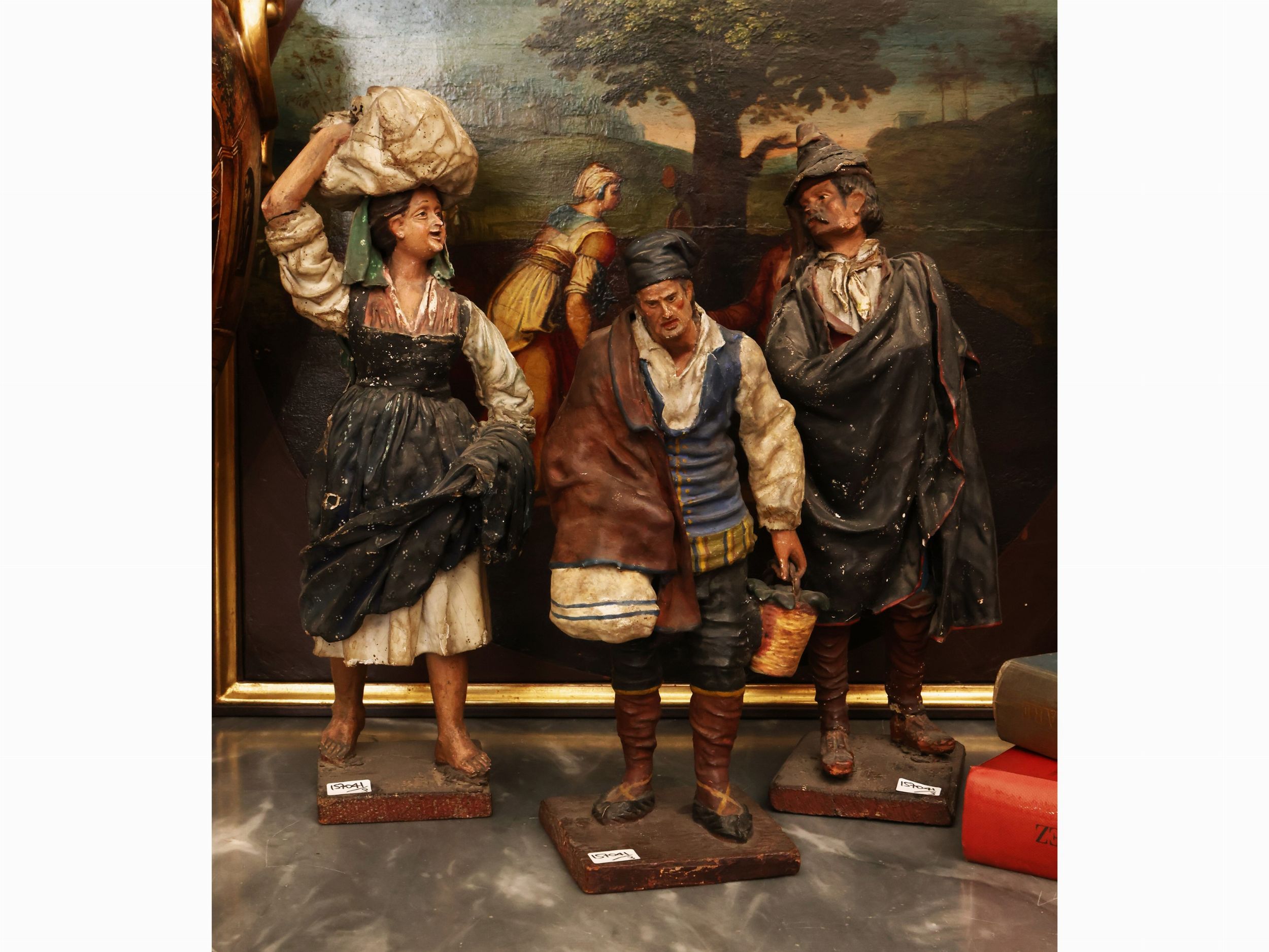 Italia meridionale, XIX secolo raffiguranti un uomo con mantello, un contadino con cesto di ortaggi ed una popolana con involto sulla testa, alcuni difetti