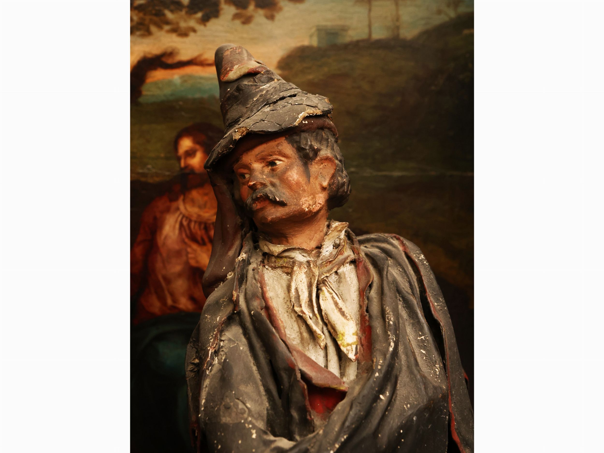 Tre personaggi da presepe in cartapesta dipinta